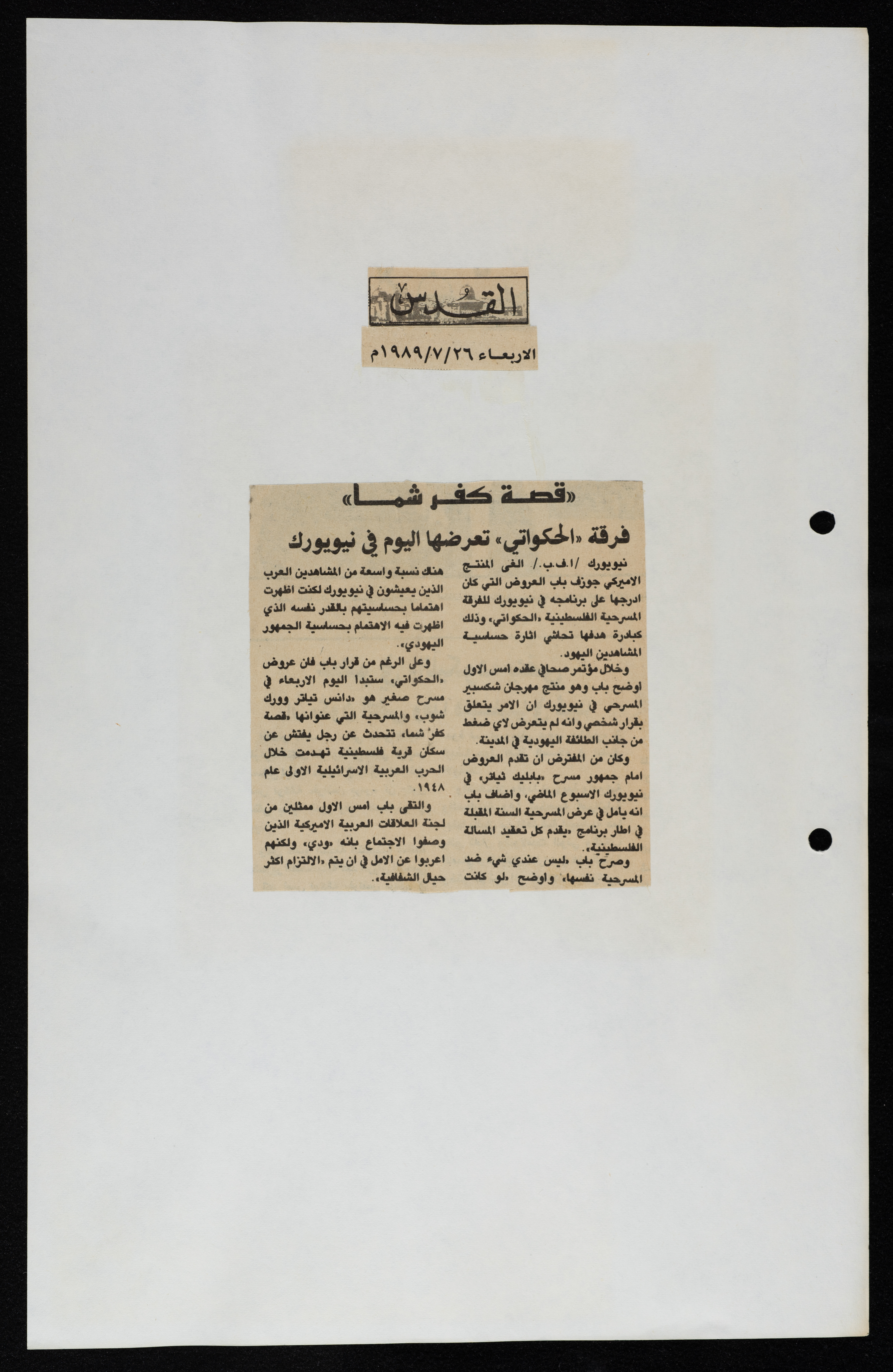 قصاصة من جريدة القدس، “قصة كفر شما: فرقة الحكواتي تعرضها اليوم في نيويورك”، 26/7/1989
