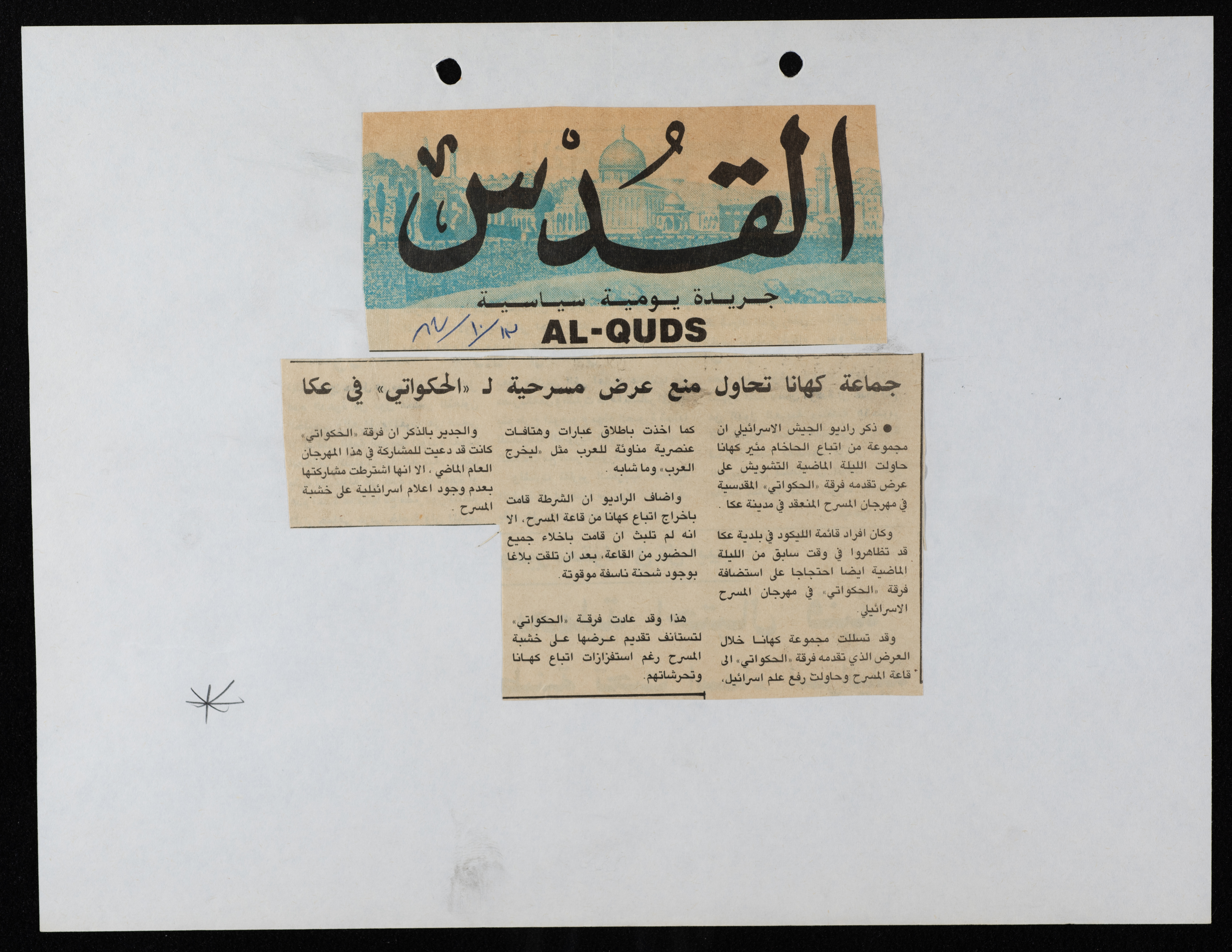 قصاصة من جريدة القدس تتضمن خبراً حول محاولة أحد المجموعات اليهودية المتطرفة "كهانا" بمنع عرض لمسرح الحكواتي في مدينة عكا عام 1987.