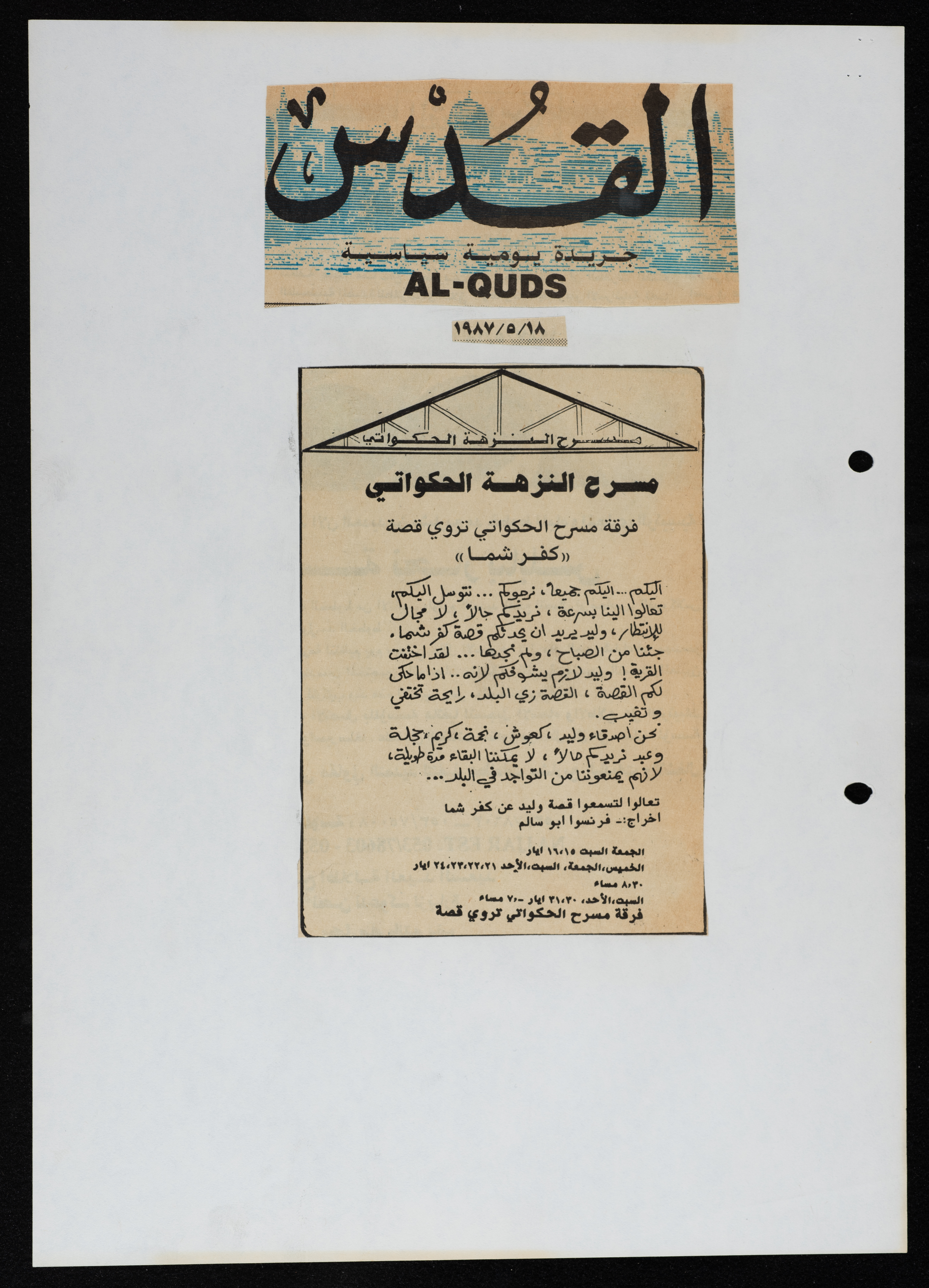 قصاصة من جريدة القدس، “دعوة لحضور مسرحية "كفر شما" لفرقة مسرح الحكواتي”، 18/5/1987