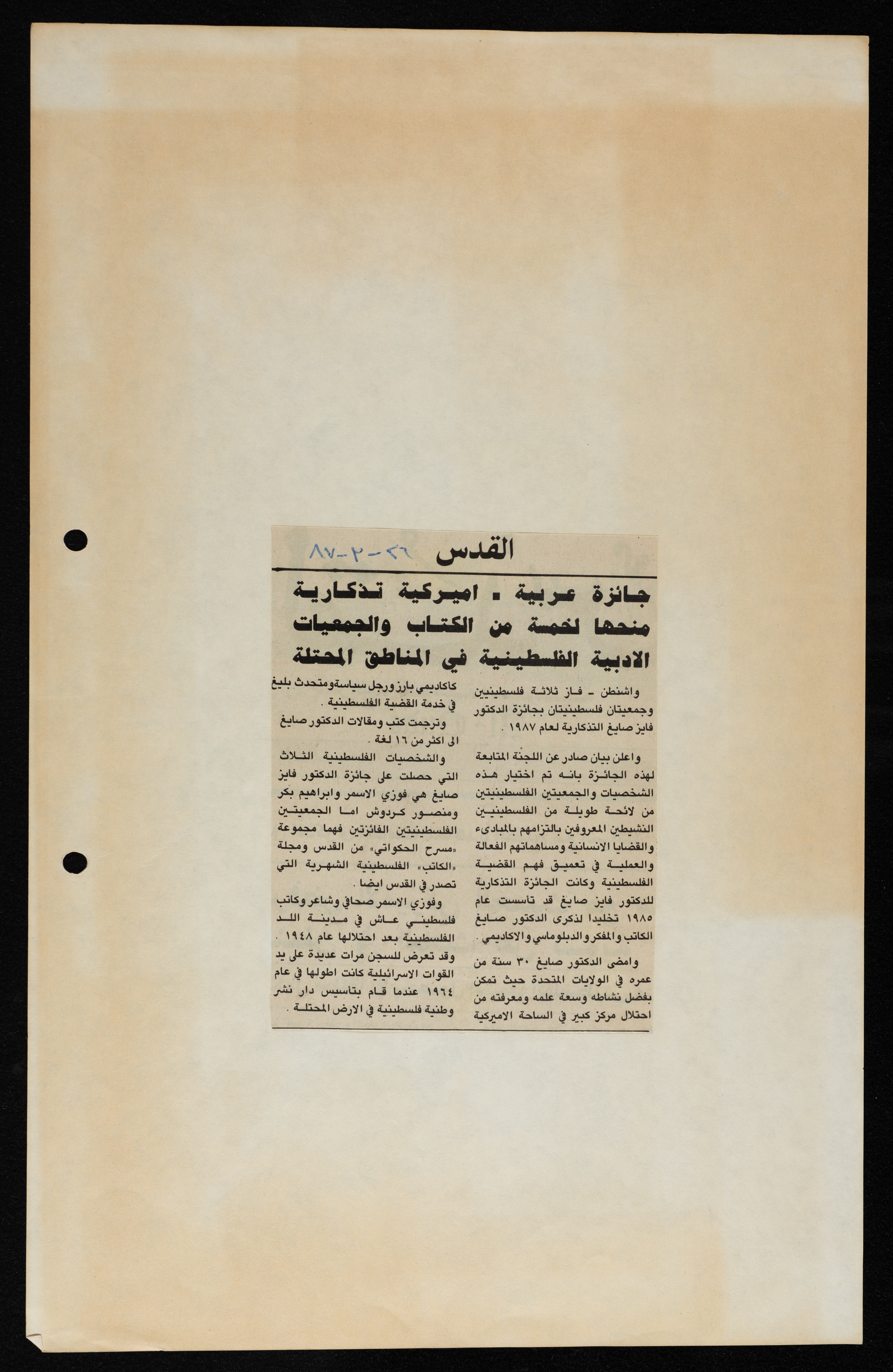 قصاصة من جريدة القدس تتضمن خبراً عن فوز ثلاثة فلسطينيين وجمعيتان فلسطينيتان بجائزة الدكتور فايز الصايغ عام 1987.
