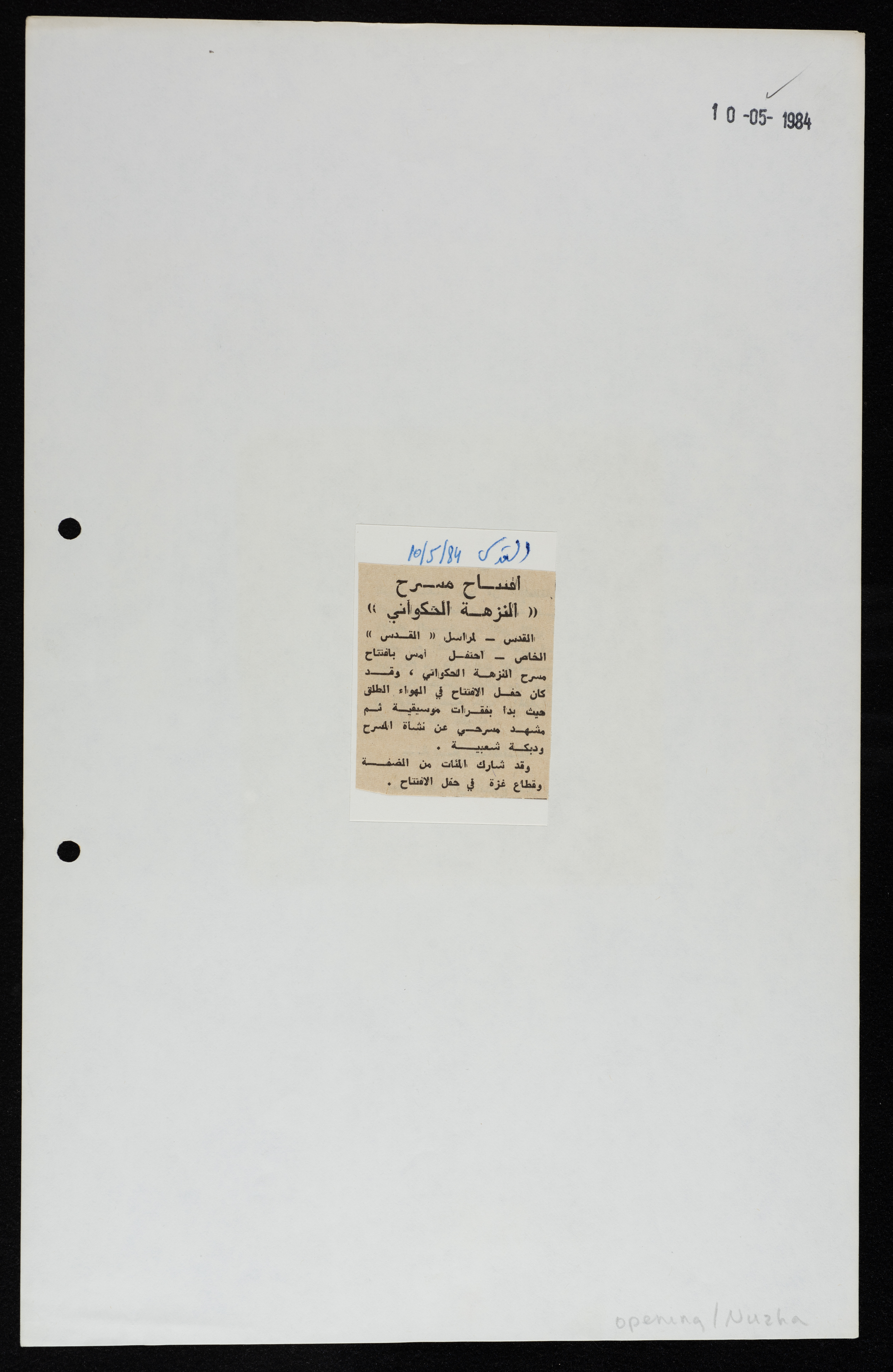 قصاصة من جريدة القدس، “افتتاح مسرح النزهة الحكواتي”، 10/5/1984