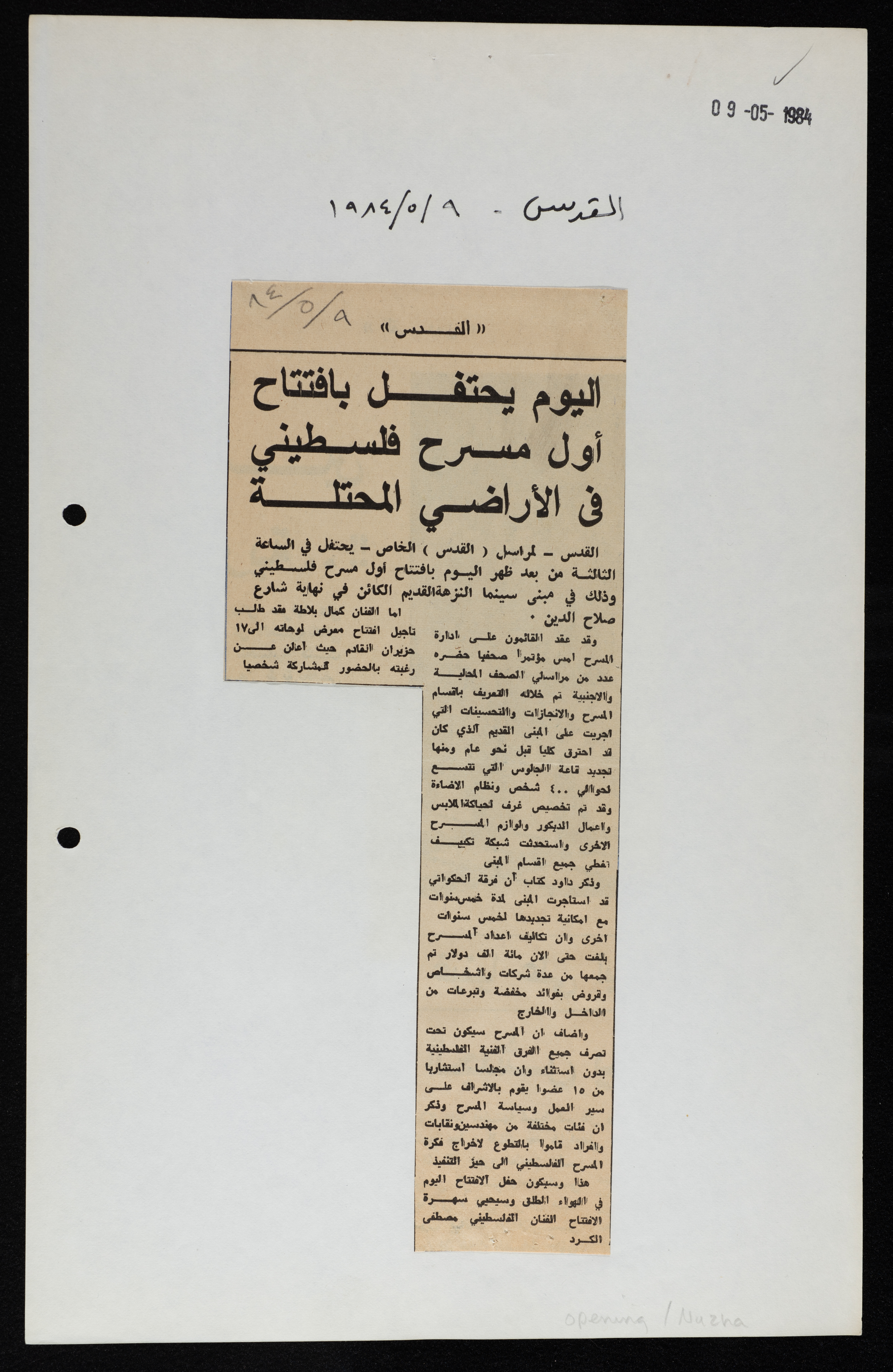 قصاصة من جريدة القدس، “اليوم يحتفل بافتتاح أول مسرح فلسطيني في الأرض المحتلة”، 9/5/1984