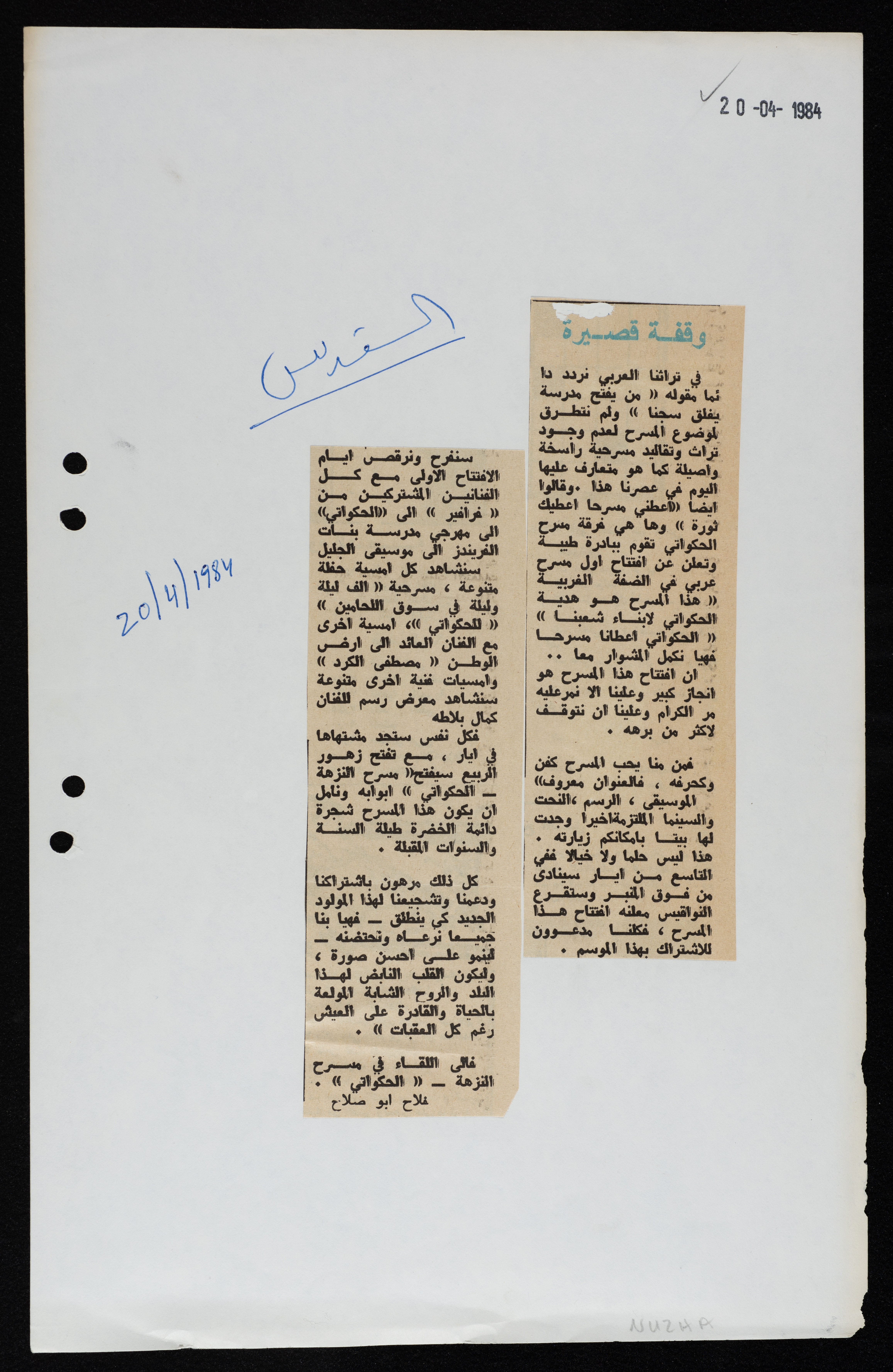 قصاصة من جريدة القدس تتضمن خبراً حول افتتاح مسرح النزهة "الحكواتي" في مدينة القدس عام 1984.