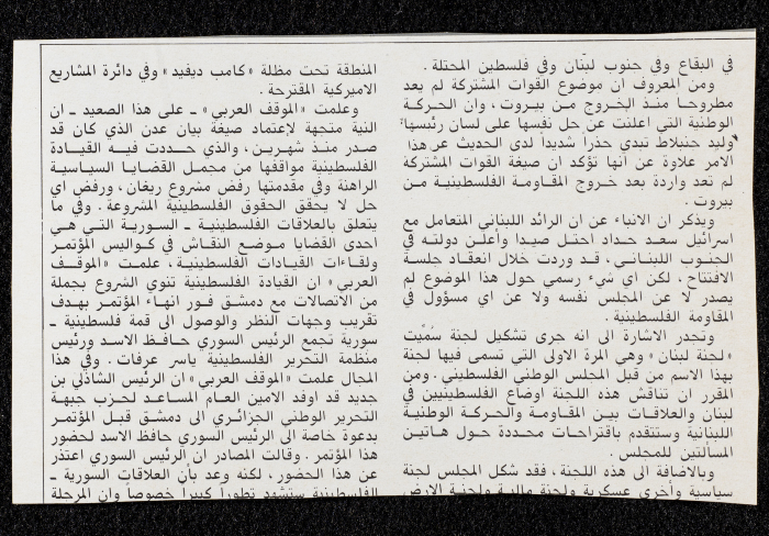 قصاصة من جريدة، تتضمن صورةً لانعقاد المجلس الوطني الفلسطيني في دورته السادسة عشرة في الجزائر العاصمة، في الفترة ما بين 19 و22 شباط 1983.