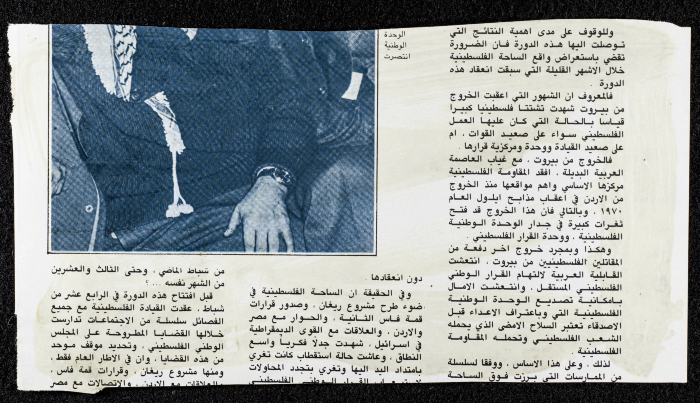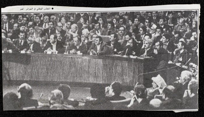 قصاصة من جريدة، تتضمن صورةً لانعقاد المجلس الوطني الفلسطيني في دورته السادسة عشرة في الجزائر العاصمة، في الفترة ما بين 19 و22 شباط 1983.