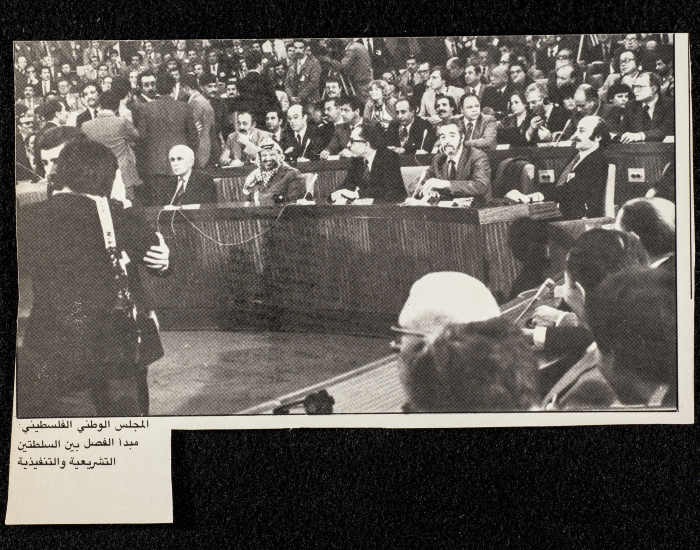 "المجلس الوطني الفلسطيني: مبدأ الفصل بين السلطتيْن التشريعية والتنفيذية"، قصاصة من جريدة، شباط 1983