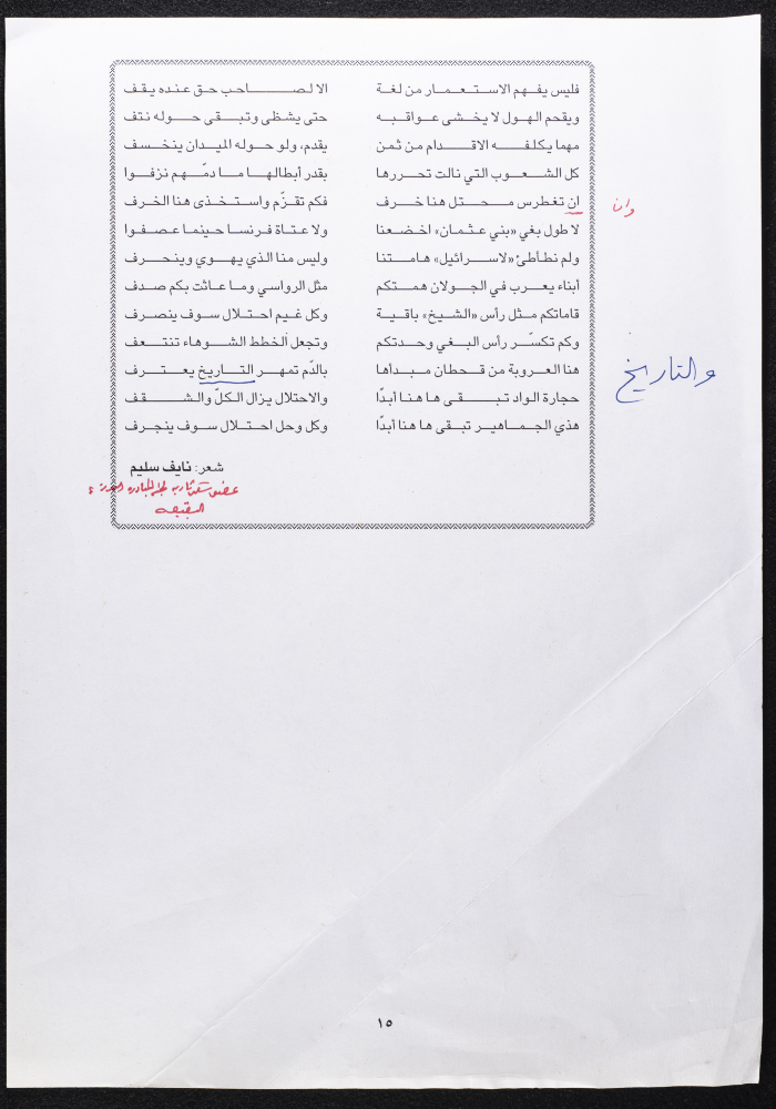 .مادة مطبوعة باللغة العربية، وهي عبارة عن شعر لنايف سليم عضة سكرتارية لجنة المبادرة في بقيعة