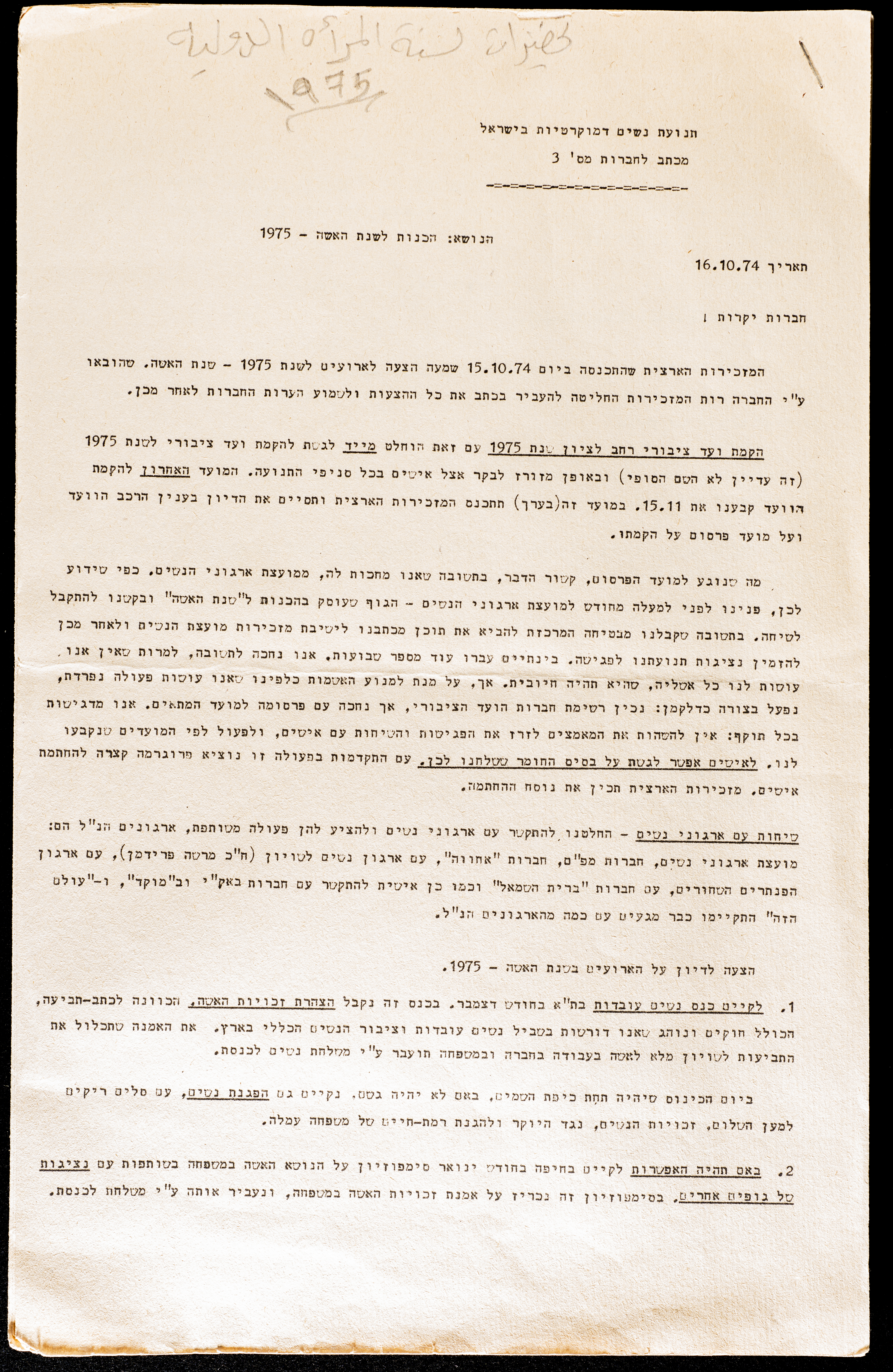 Printed in Hebrew by the Movement of Democratic Women, this document shows the preparations for the International Women's Year, which was declared in 1975 by the United Nations.
