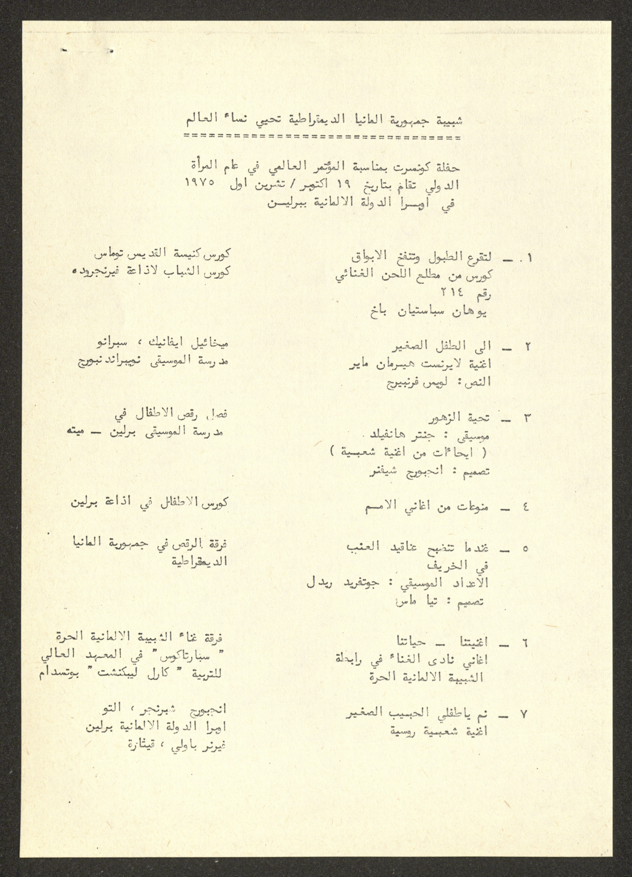 Printed in Arabic, this document shows an invitation from the German Democratic Republic to a concert on the International Conference of the International Women's Year in Berlin on 19 October 1975.