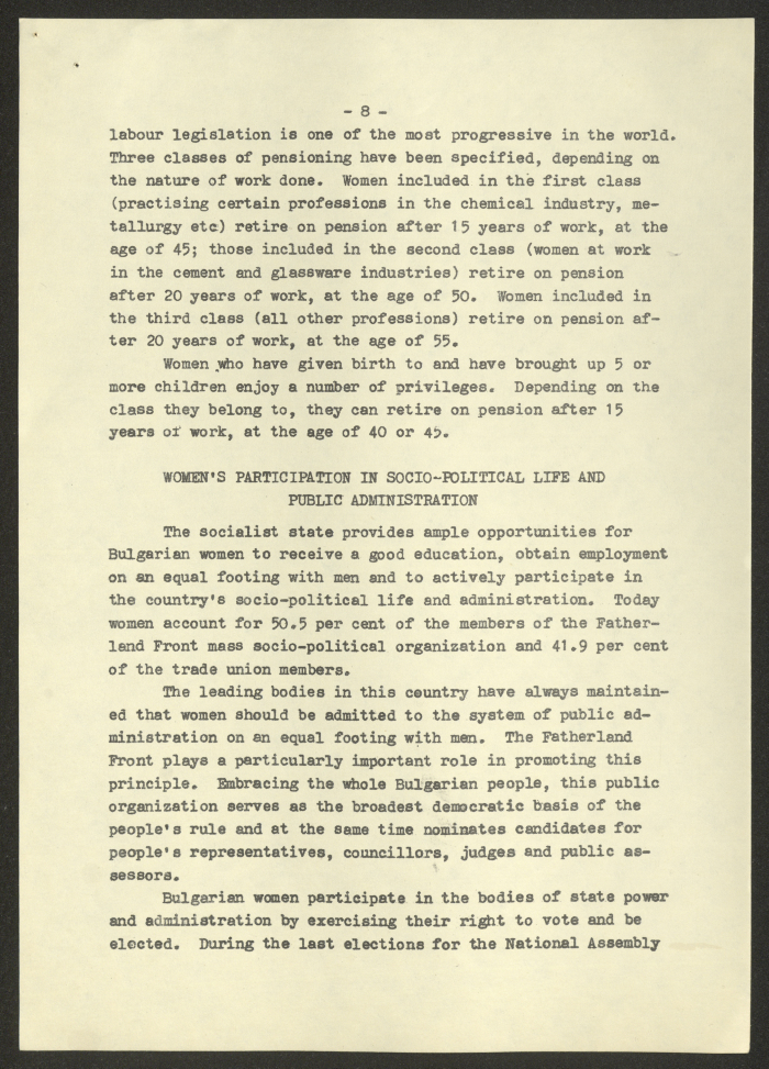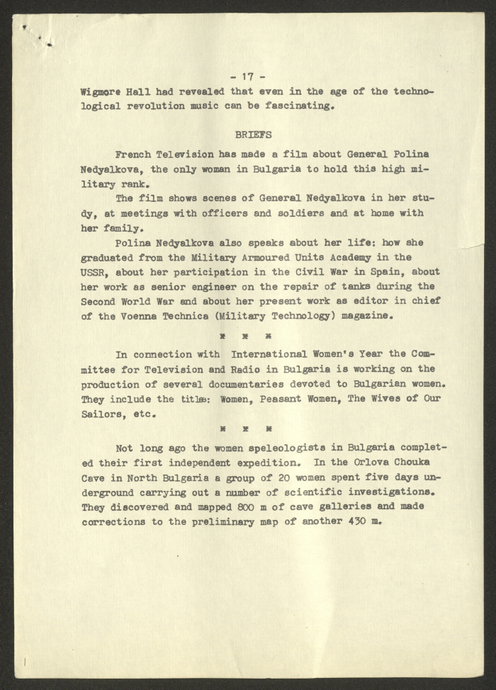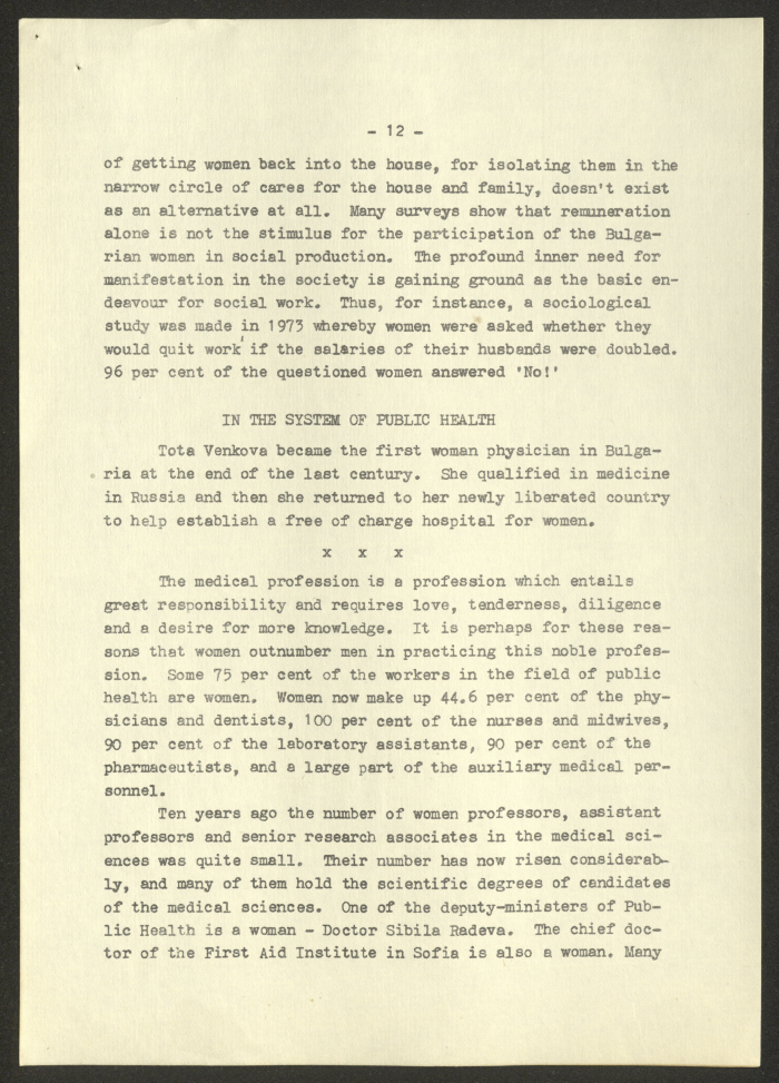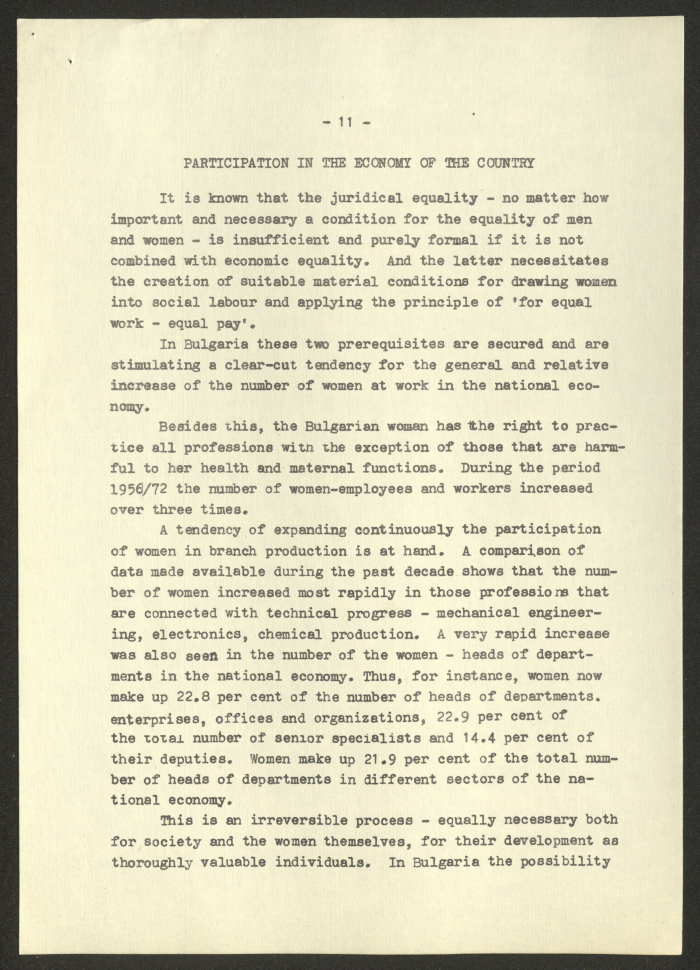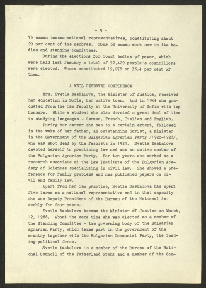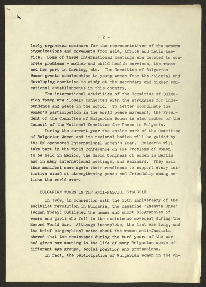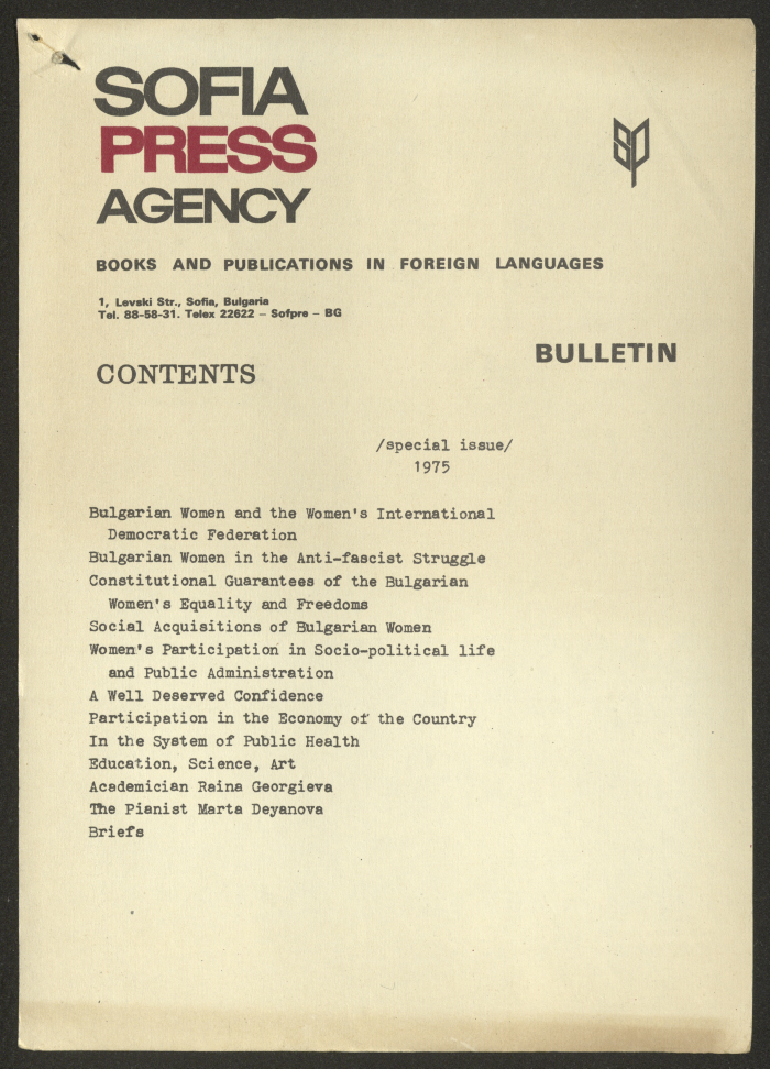 مادة مطبوعة باللغة الانجليزية، تتضمن تقربر عن "المرأة البلغارية والاتحاد النسائي الديمقراطي الدولي" صادر عن صوفيا وكالة صحافة عام 1975