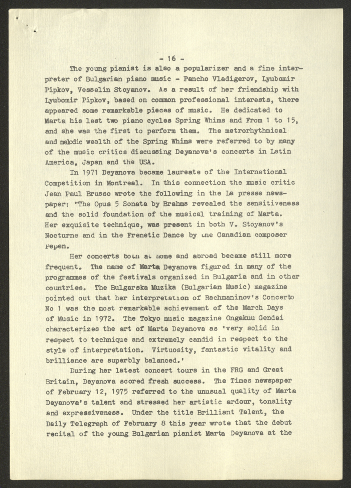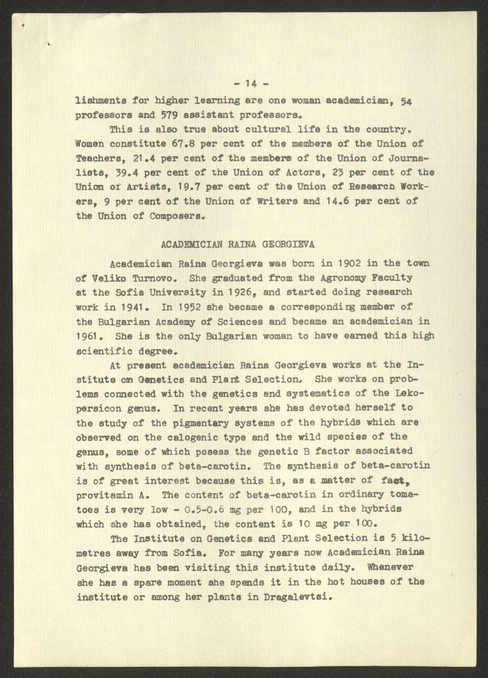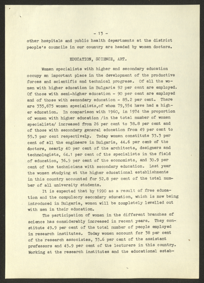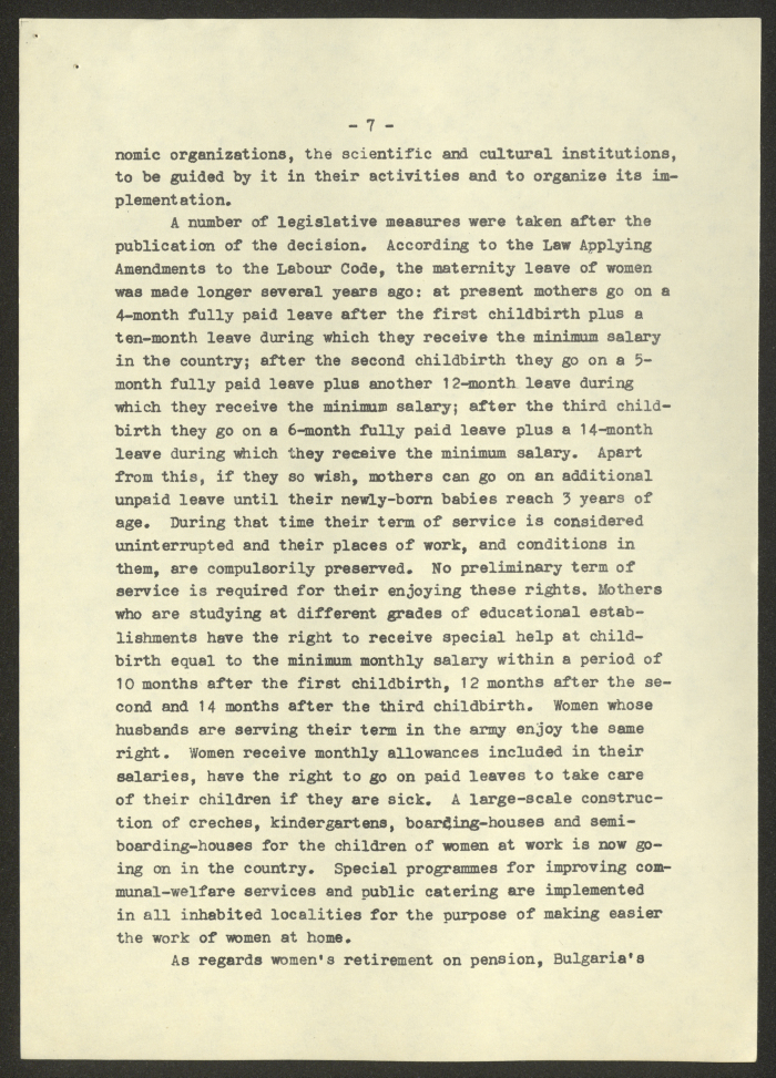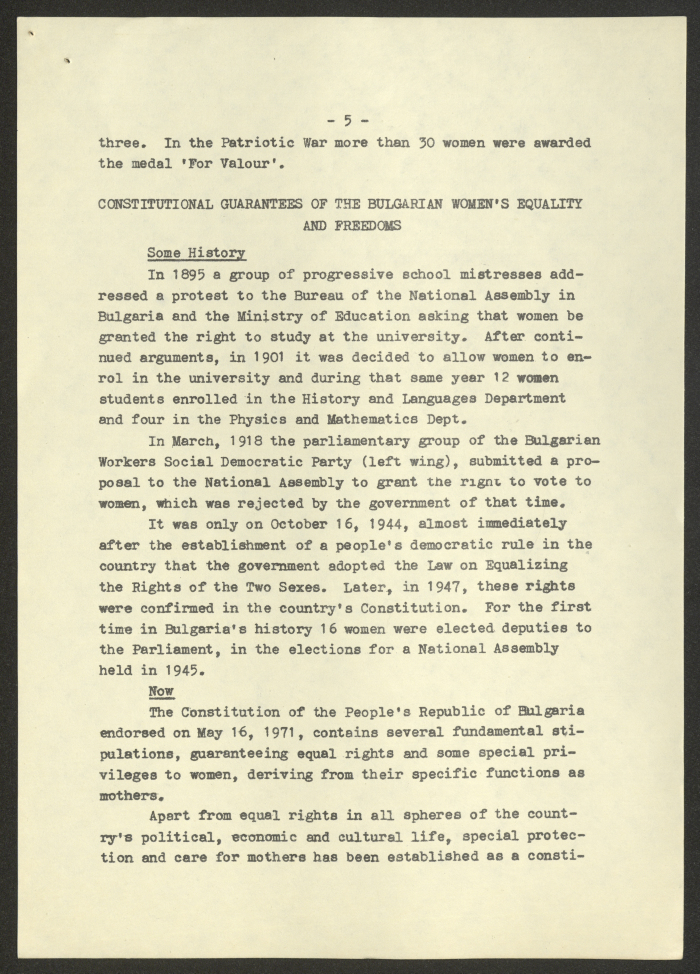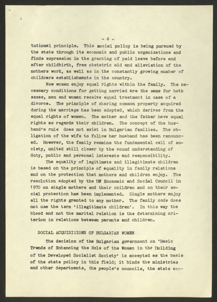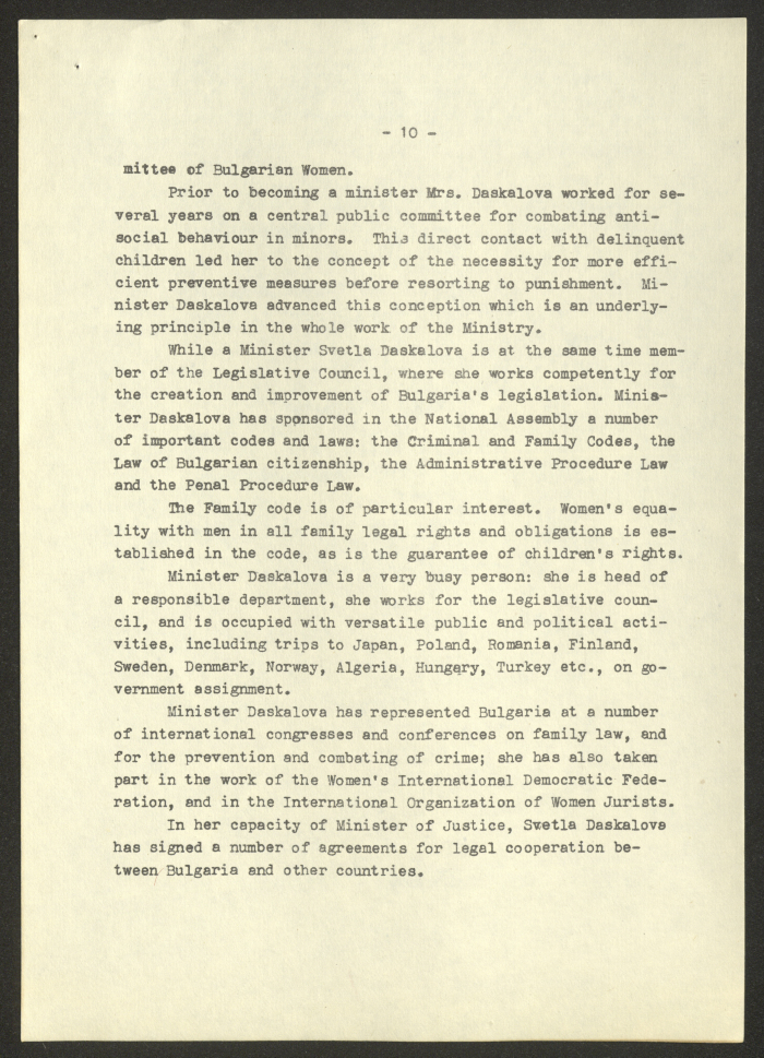 مادة مطبوعة باللغة الانجليزية، تتضمن تقربر عن "المرأة البلغارية والاتحاد النسائي الديمقراطي الدولي" صادر عن صوفيا وكالة صحافة عام 1975