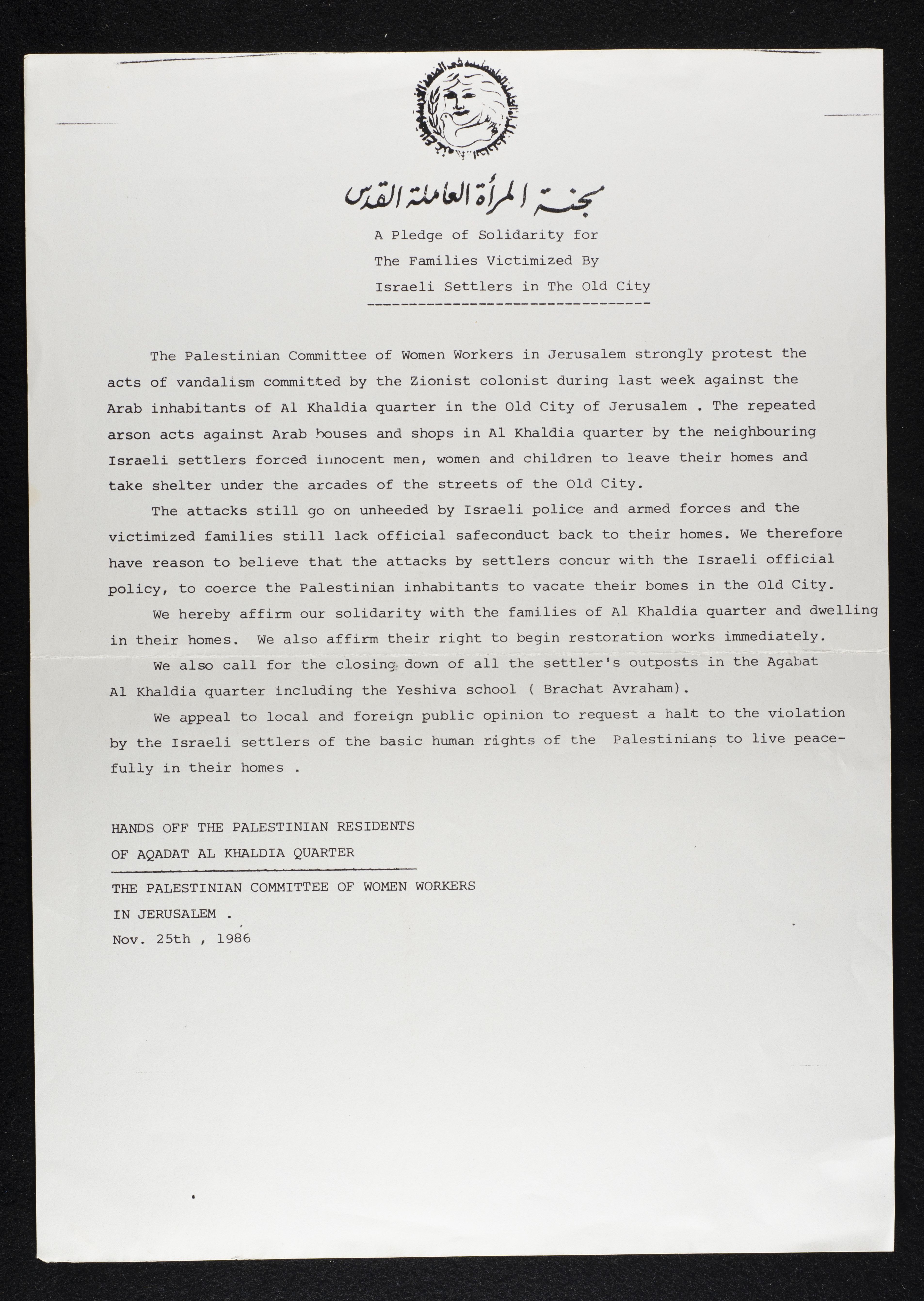 Printed in Arabic, this document shows a pledge of solidarity for the families victimized by Israeli colonizers in the Old City of Jerusalem by the Palestinian Committee of Women Workers on 25/11/1986.