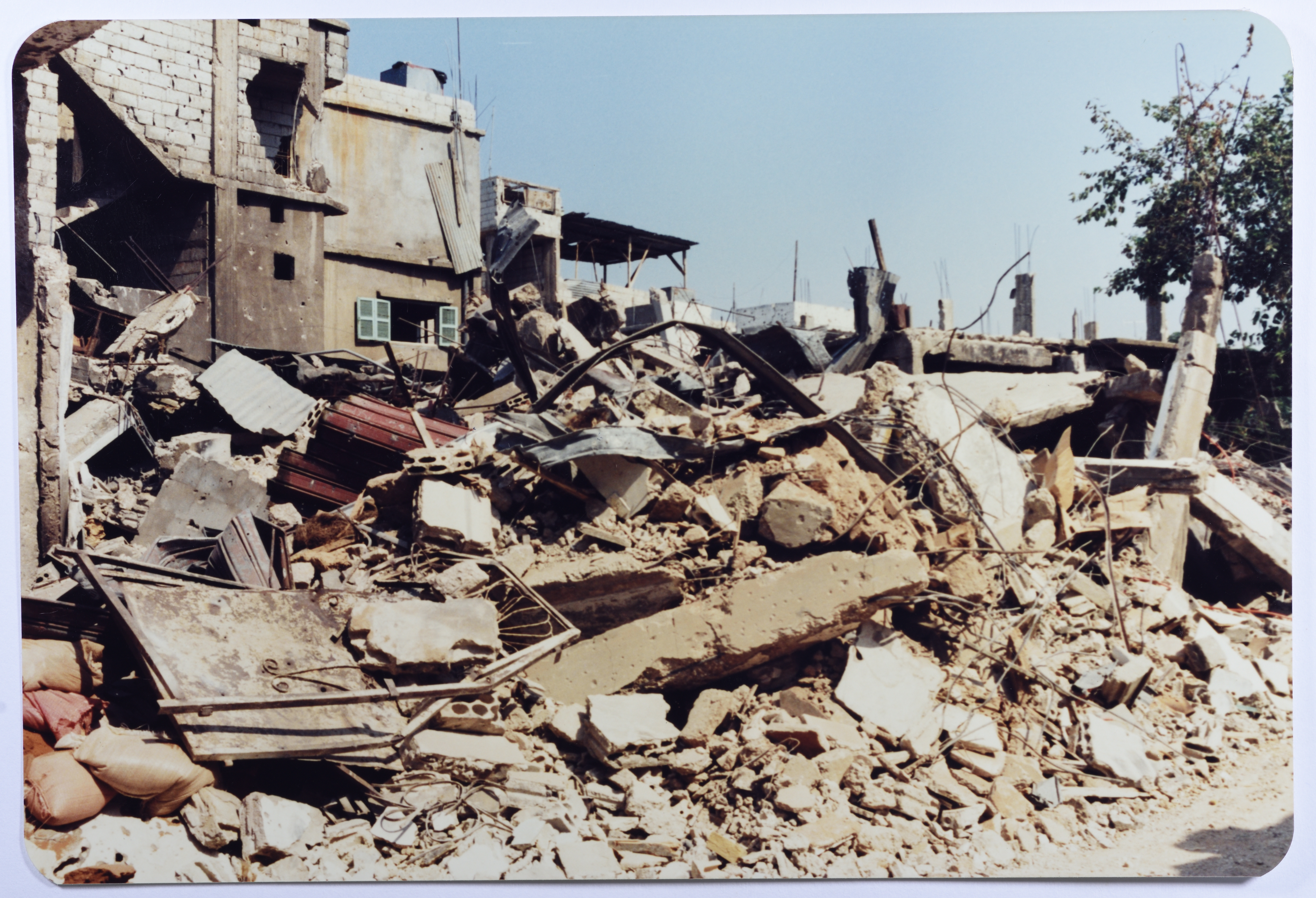 صورة لأحد مشاهد الدمار الذي طال مخيم شاتيلا للاجئين الفلسطينيين في لبنان، في أعقاب حرب المخيمات. والتُقطت الصورة بتاريخ 15 تموز 1988.
