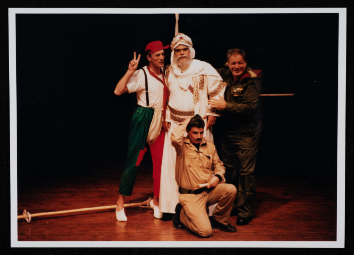 Taken in 1994 at al-Kasaba Theatre and Cinematheque in Ramallah, this colour photograph captures a freeze of Muhammad al-Maghut's play, "The Clown". Directed by Makram Khury, the play ran also in al-Kasaba Theatre in Jerusalem as well as in Galilee and Jordan. The play featured a cast of actors, including Muhammad al-Bakry, Ghassan ʿabbas, George Ibrahim, ʿamer Khalil, ʿarin ʿumary, Husam abu ʿaysha, Khalid al-Maṣu, and Mahmud ʿawad.
