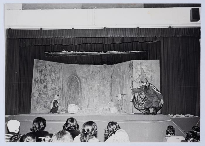 Taken in 1980, this colour photograph shows the premiere production of George Ibrahim's children theatre show, "The Dwarf and the Miller's Daughter" at al-Kasaba Theatre and Cinematheque.