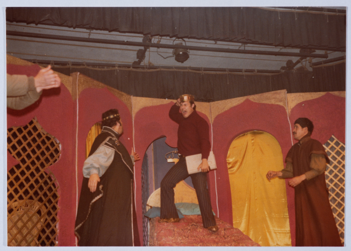 Taken in 1980, this colour photograph shows the premiere production of George Ibrahim's children theatre show, "The Dwarf and the Miller's Daughter" at al-Kasaba Theatre and Cinematheque.