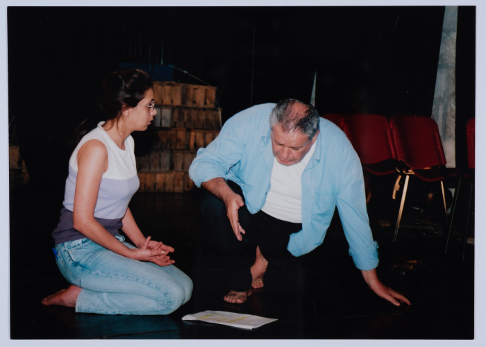 Taken in 1986 at al-Kasaba Theatre and Cinematheque, this colour photograph captures a freeze of David Greg's play "It is not About a Rummaneh". Translated into Arabic by George Ibrahim and directed by Rufus Norris, the play featured a cast of actors, including Khalifa Natur, Mahmud 'awad, Kamel al-Basha, Husam abu ʿeisheh, Georgina ʿaṣfur, ʿimad Farrajin, Manal 'awad, Nizar Zu’oby, Ibrahim ʿlayut, and Samer abu ʿeisheh. Jamil as-Sayeh composed the background music. The play was performed only once due to the outbreak of the First Intifada.