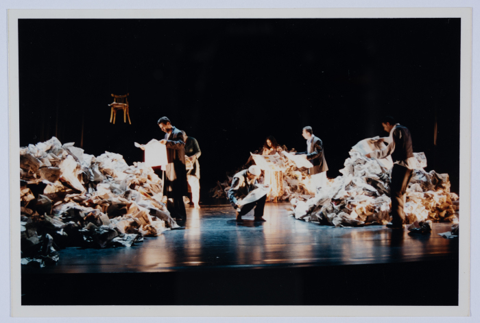 A colour photograph of a performance of George Ibrahim al-Khury's play, "Alive from Palestine: Stories Under Occupation". Produced by al-Kasaba Theatre and Cinematheque and Directed by Nizar az-Zuʿby, the play ran for over 500 performances in the Arab World, North America, Japan, and Singapore, featuring a cast of actors, including ʿimad Farrajin, Khalifa Natur, Georgina ʿaṣfur, Khalid al-Maṣu, Kamel al-Basha, and Ismaʿil ad-Dabagh. In 2001, "Stories Under Occupation" won the first prize at the Cairo International Festival for Contemporary and Experimental Theatre and the Carthage Theater Days Festival.