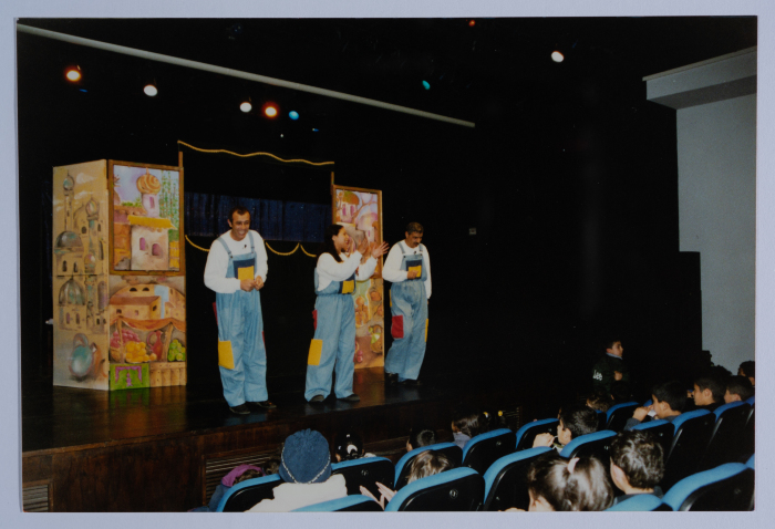 A colour photograph capturing a glimpse of al-Kasaba Theatre and Cinematheque's "The Shoemaker and the Sultan" in 2002. This children's theatre show was written and directed by George Ibrahim.