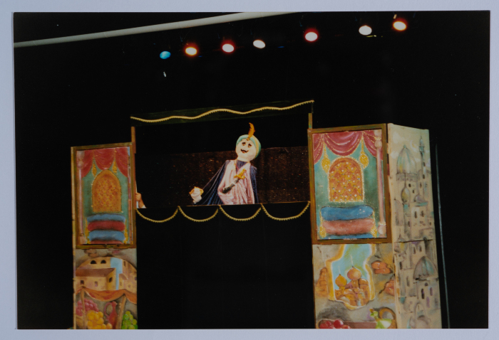 A colour photograph capturing a glimpse of al-Kasaba Theatre and Cinematheque's "The Shoemaker and the Sultan" in 2002. This children's theatre show was written and directed by George Ibrahim.