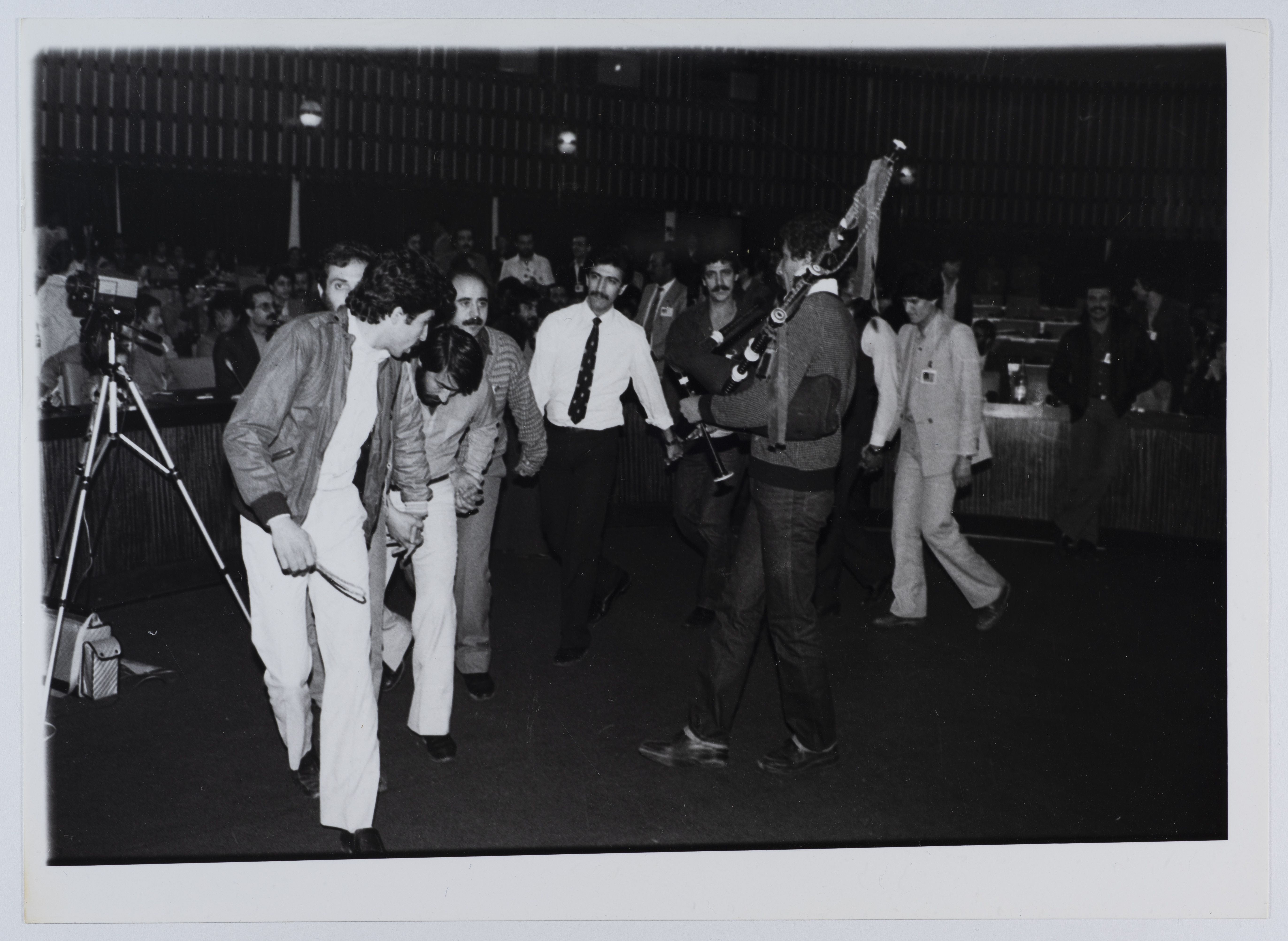 A photograph of a dabkeh show that was performed by the participants of the 9th Annual Congress of the General Union of Palestinian Students (GUPS) in Algeria on 12-17 February 1984.