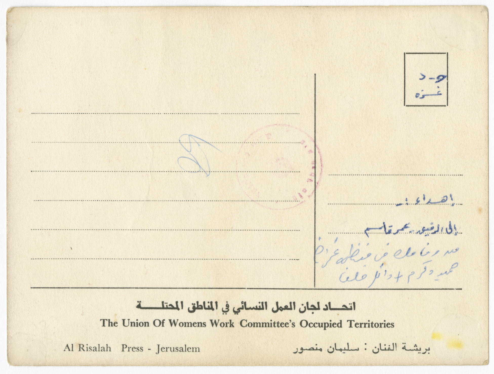 Sent during the 1980s, this document shows a postcard gifted to Omar al-Qasim from his comrades, Hamid, Karam and Wael Khalaf in Gaza. This postcard was issued by the Union of Palestinian Women's Committees in the 1948 Palestinian Occupied Territories and it shows a painting by the artist, Suleiman Mansour.