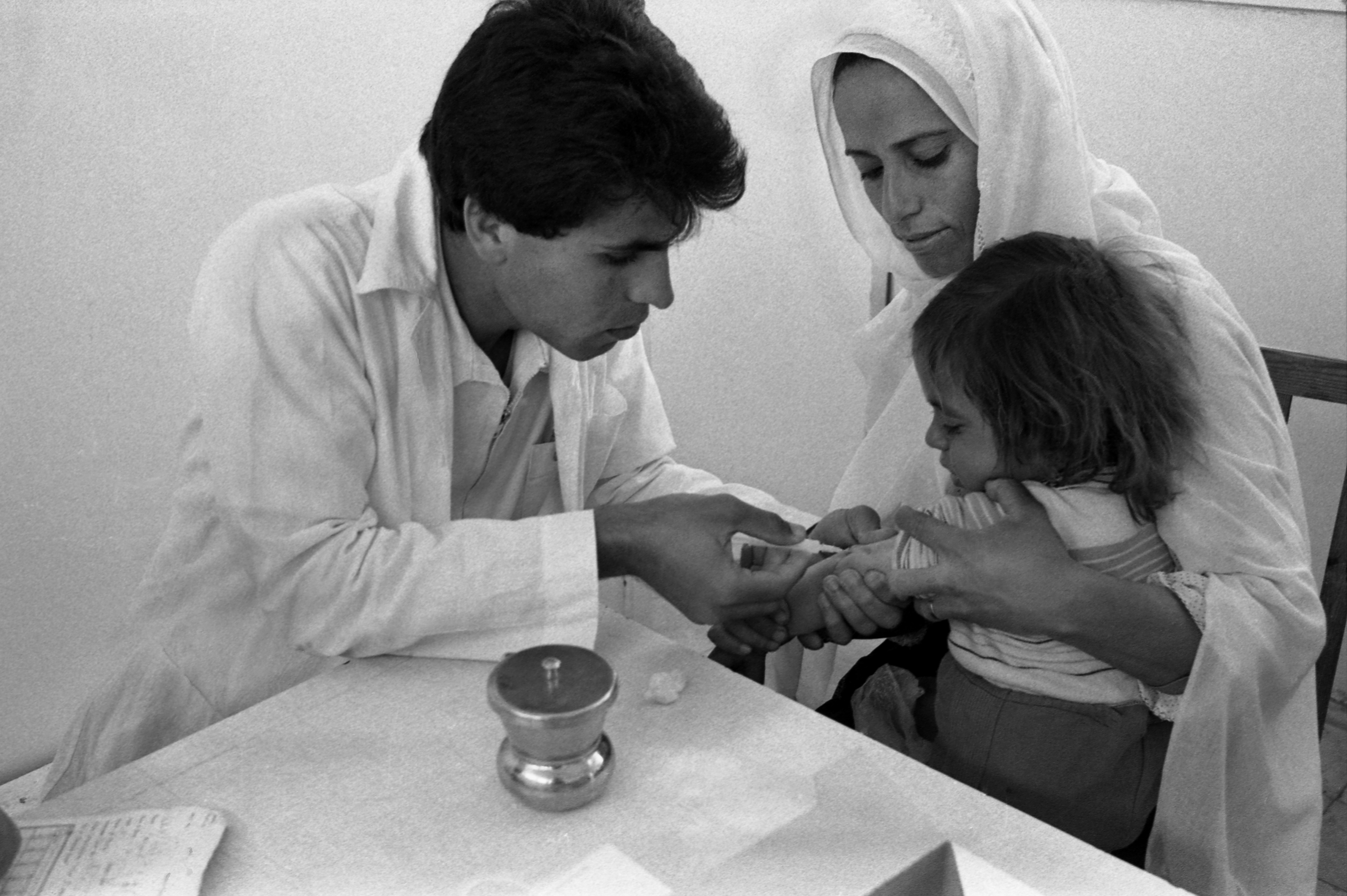 Taken in the Shati Palestinian Refugee Camp in Gaza City, during a vaccination campaign, this black-and-white photograph captures a glimpse of a mother with her child in the UNRWA maternity ward.