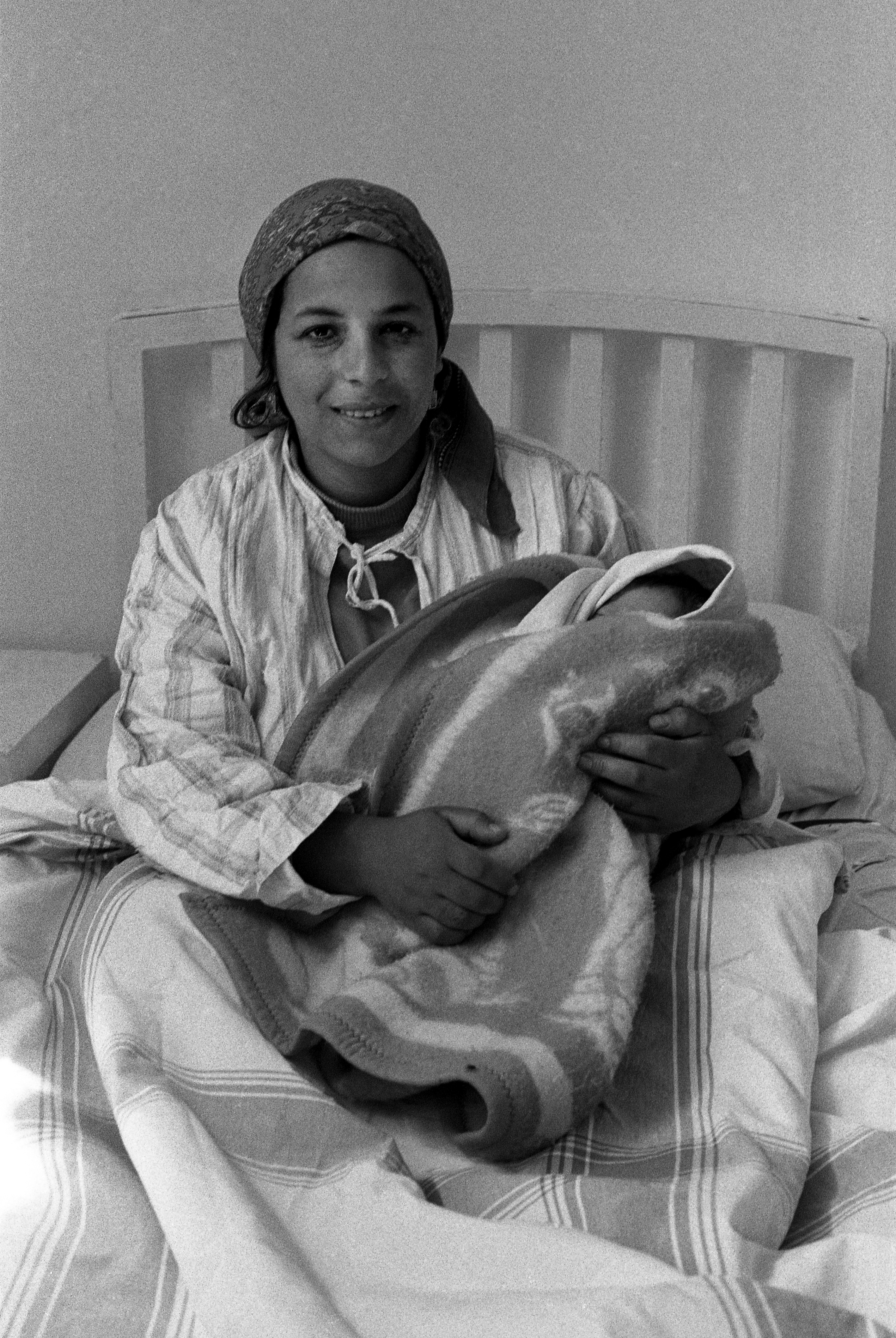 صورة غير ملونة لأم تحتضن طفلها حديث الولادة داخل عيادة تابعة لوكالة الأمم المتحدة لإغاثة وتشغيل اللاجئين الفلسطينيين في مخيم الشاطئ في مدينة غزة.