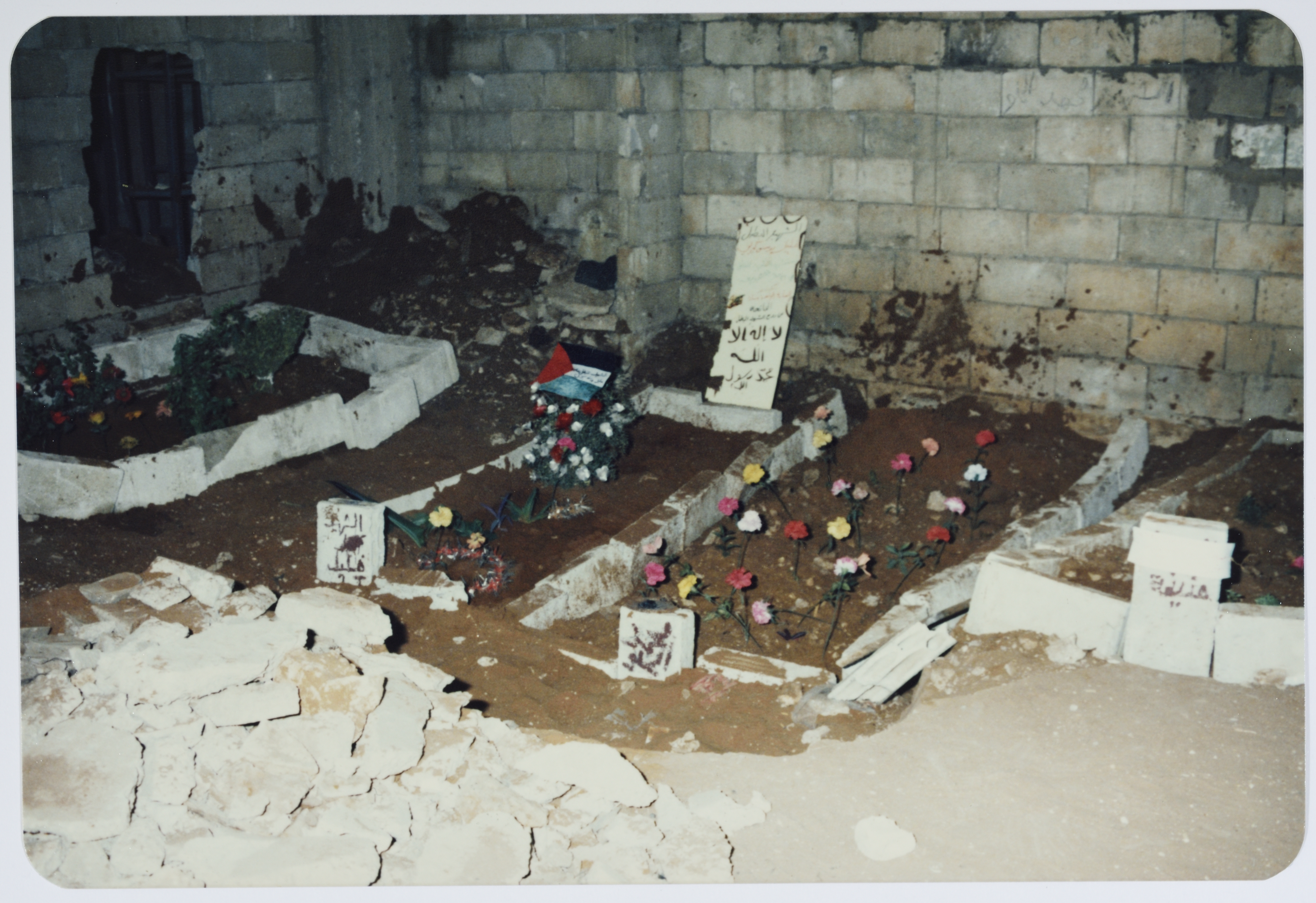 صورة لمقبرة جماعية لشهداء حرب المخيمات، في مخيم شاتيلا للاجئين الفلسطينيين في لبنان. والتُقطت الصورة في عام 1986.