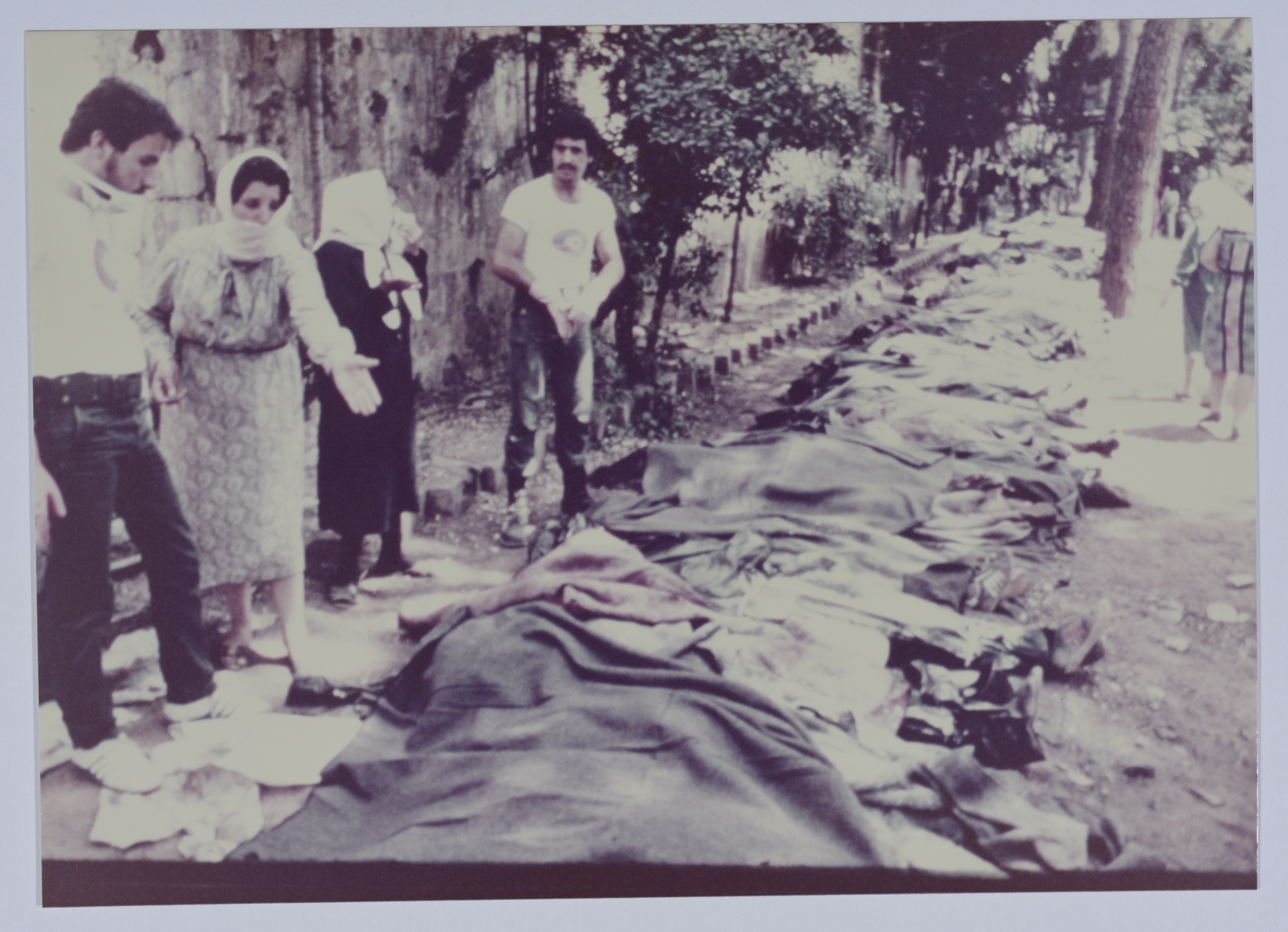 صورة ملونة للأهالي يقومون بالتعرف على جثامين الشهداء. وتظهر في الصورة عشرات الجثامين المسجاة والموضوعة على الأرض. ألتقطت الصورة خلال حرب المخيمات.