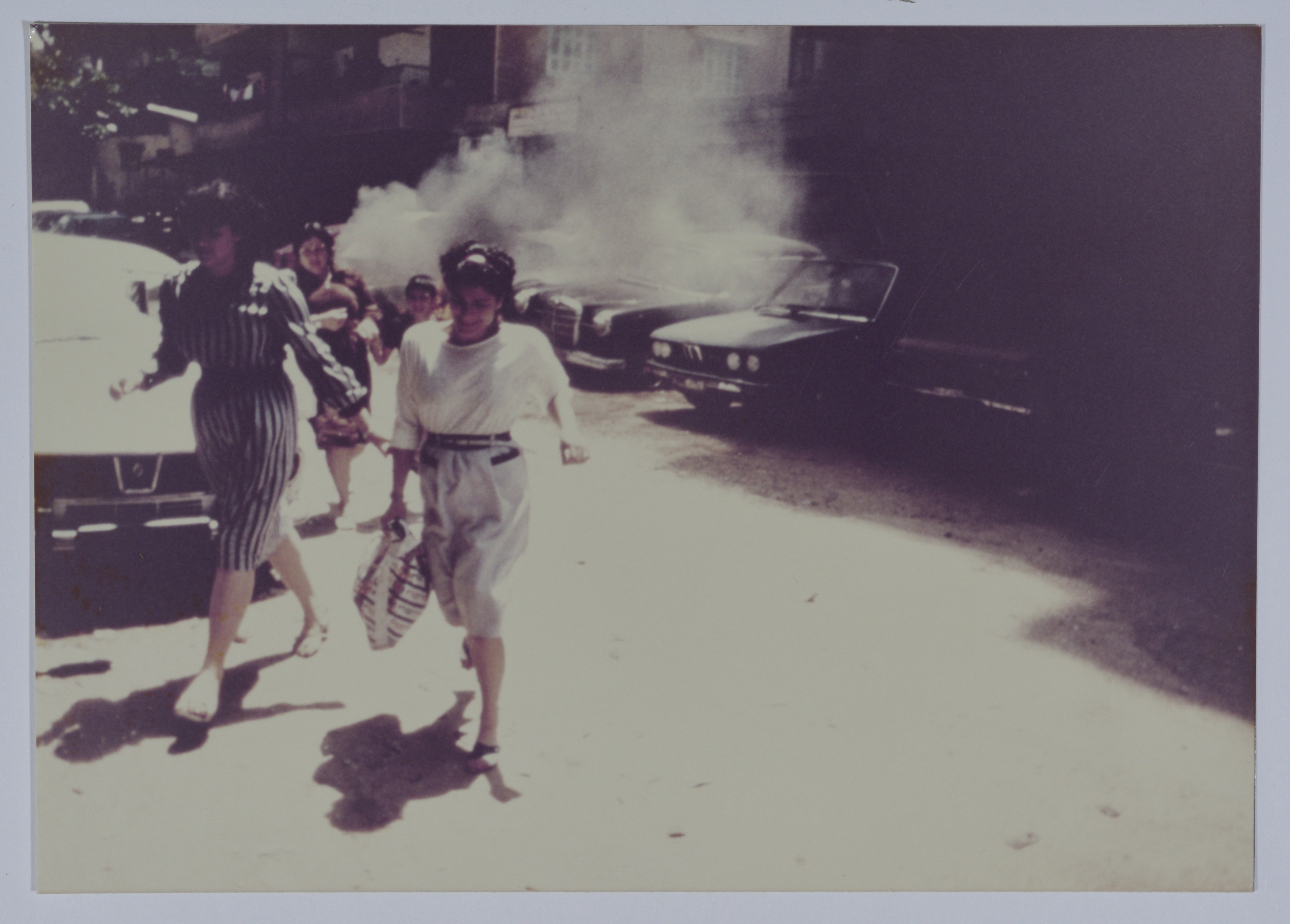 A colour photograph of women in plainclothes running away from an explosion during the War of the Camps.
