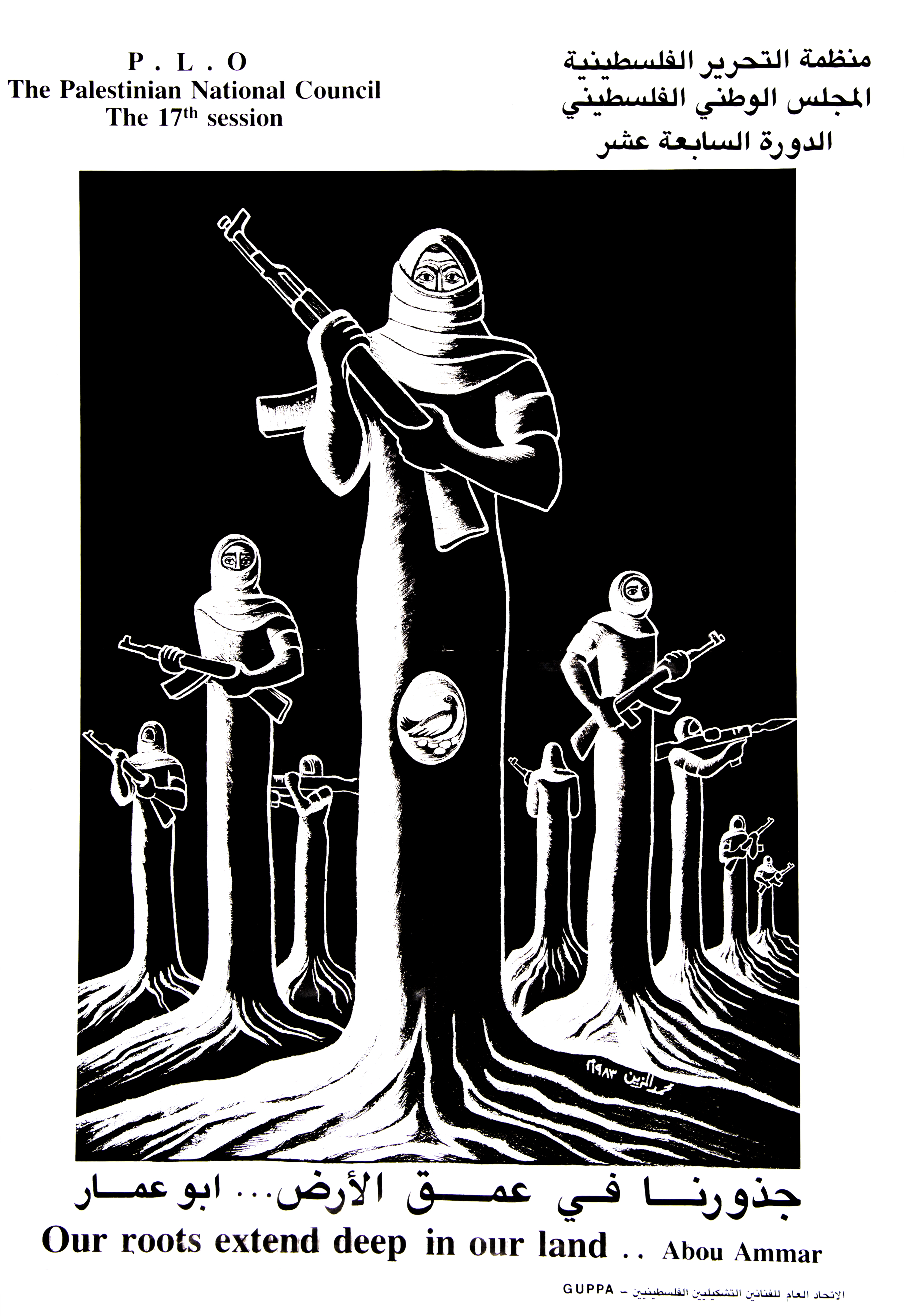 ملصق بعنوان "جذورنا في عمق الأرض.. أبو عمار" صادر عن الاتحاد العام للفنانين التشكيليين الفلسطينيين عام 1984، بالتزامن ودورة المجلس الوطني السابعة عشر. يضم الملصق لوحة لمحمد المزين رسمها عام 1983.