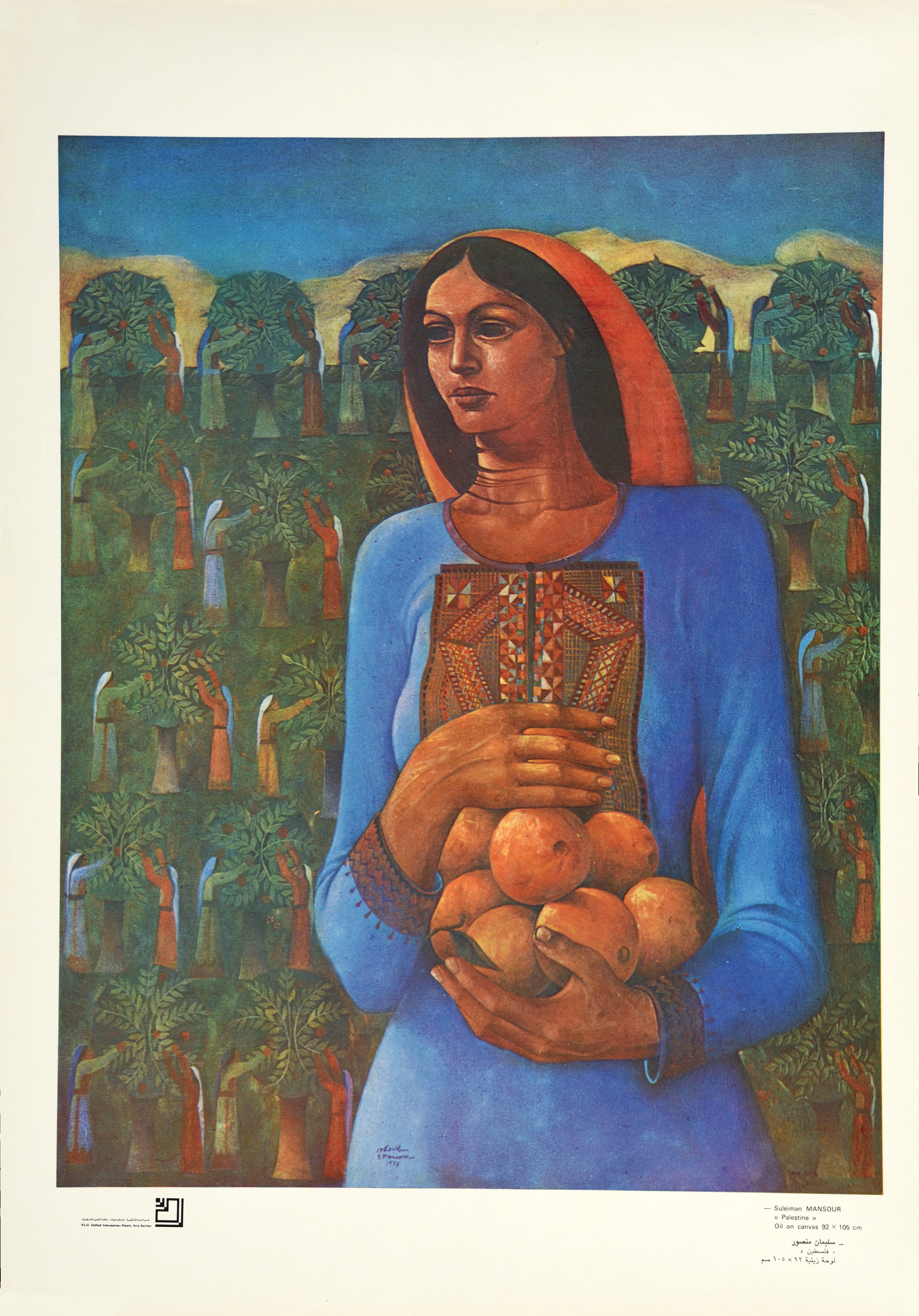 ملصق بعنوان "فلسطين" صادر عن قسم الفنون التشكيلية في الإعلام الموحد التابع لمنظمة التحرير الفلسطينية، يتضمن لوحة للفنان الفلسطيني سليمان منصور قام برسمها عام 1977، ونشرتها المنظمة عام 1981.