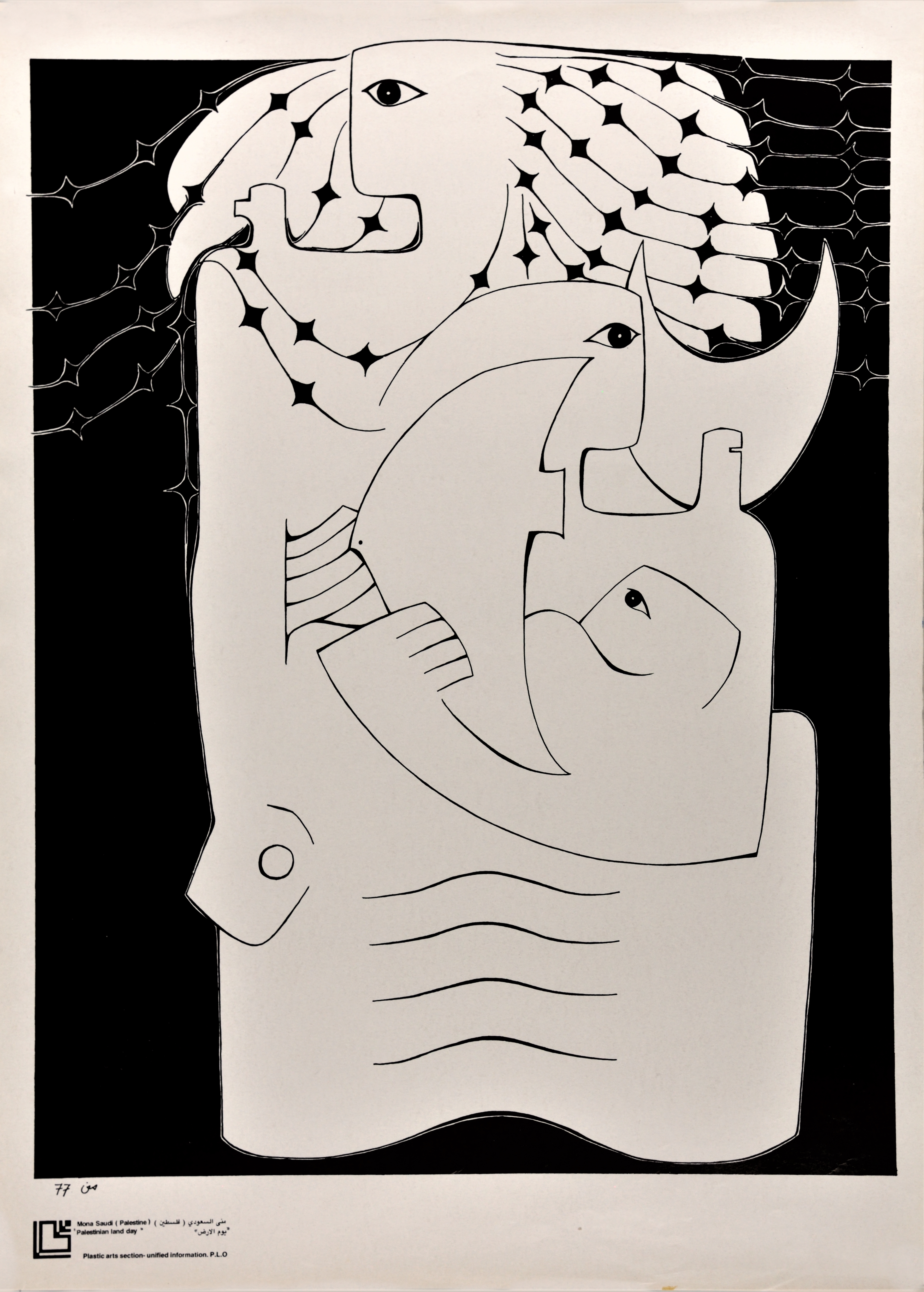 ملصق صادر عن الاتحاد العام للمرأة الفلسطينية في يوم الأرض عام 1977 يتضمن لوحة تكعيبية للفنانة التشكيلية الفلسطينية منى السعودي.