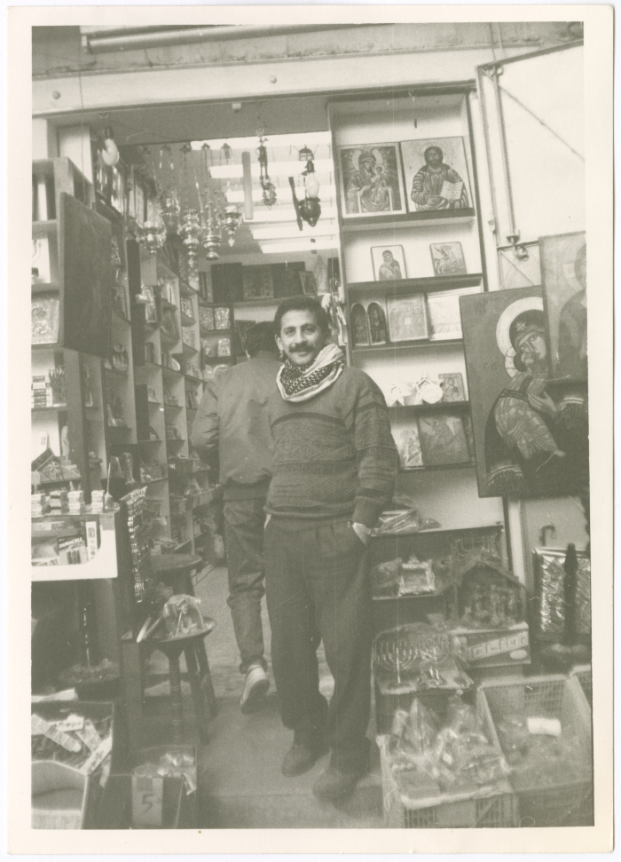 صورة غير ملونة لعيسى جابر في دكانه بالقرب من كنيسة القيامة في القدس، وُجدت ضمن مجموعة موسى علوش.