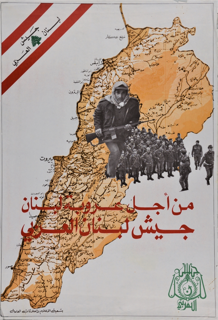 ملصق بعنوان "من أجل عروبة لبنان" صادر عن شعبة الإعلام والعلاقات العامة لجيش لبنان العربي عام 1975.
