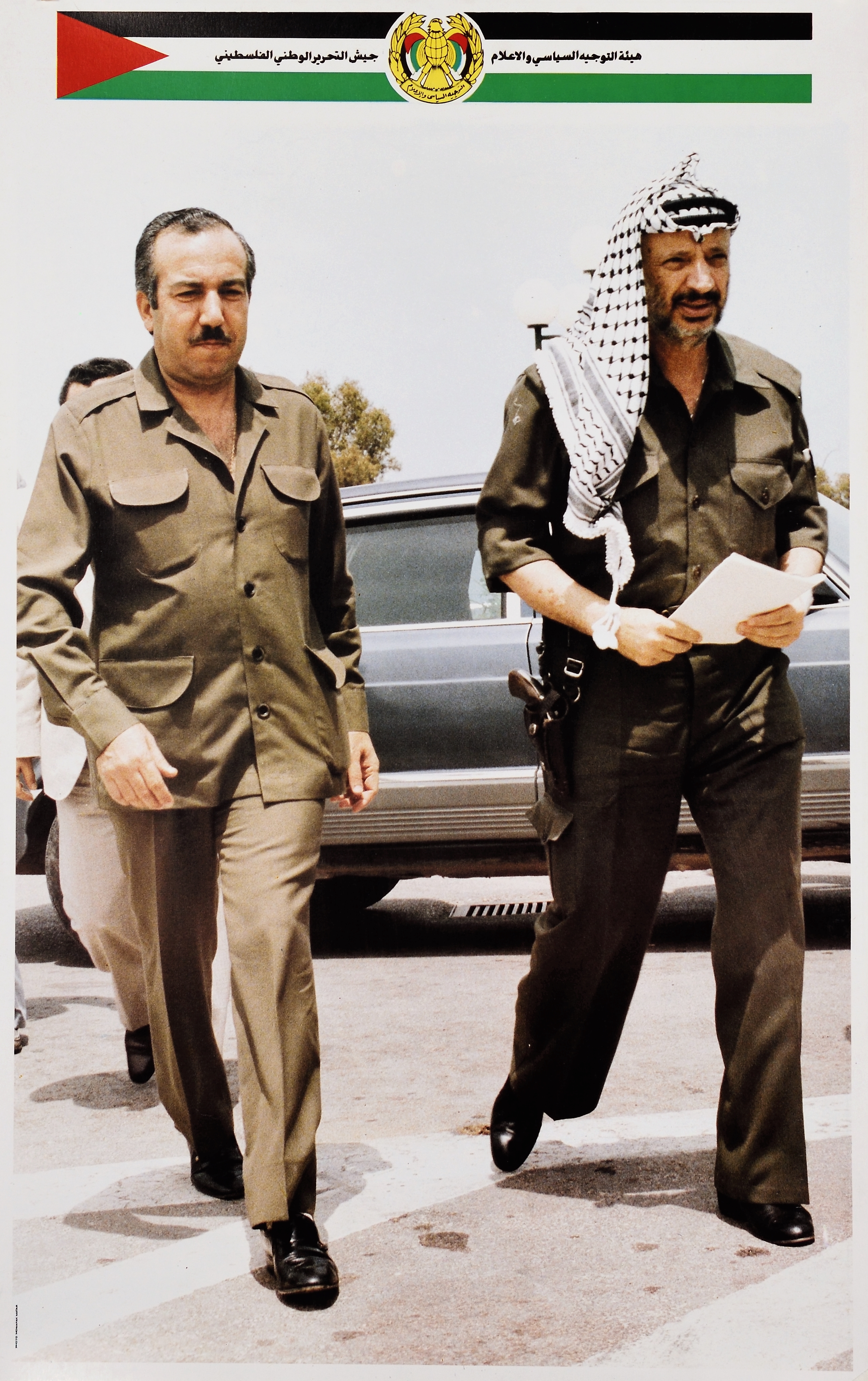 ملصق صادر عن هيئة التوجيه السياسي والإعلام التابعة لمنظمة التحرير الفلسطينية يتضمن صورة لياسر عرفات وخليل الوزير.
