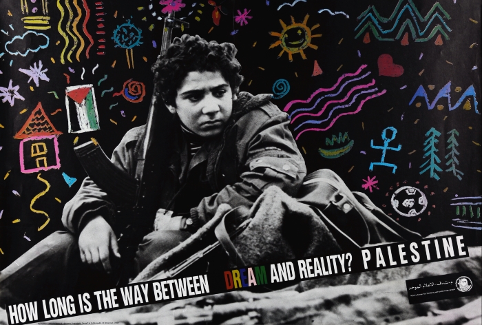 ملصق بعنوان "فلسطين: كم تطول المسافة بين الحلم والواقع؟" صادر عن الإعلام الموحد لمنظمة التحرير الفلسطينية عام 1988.