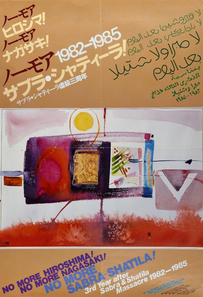 Issued by the Palestine Liberation Organization (PLO) Office in Japan in 1985, this poster titled "No More Hiroshima, No More Nagasaki, No More Sabra-Shatila" includes artwork by Palestinian artist Vladimir Tamari in 1982, which was designed by Japanese artist Toshio Satoh.