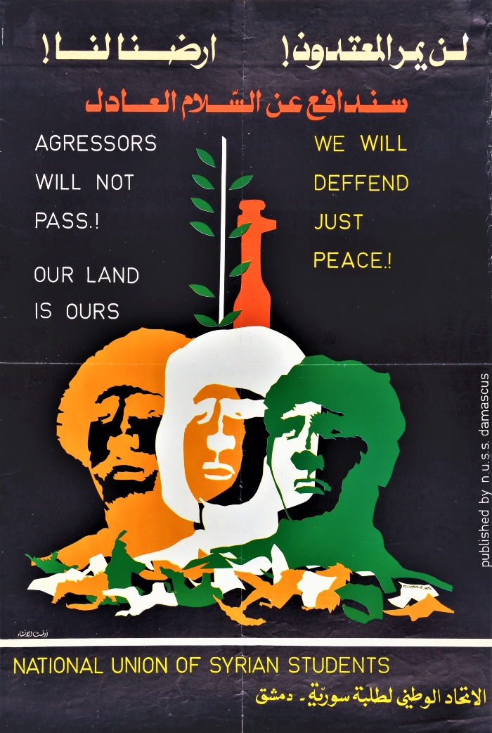 This poster titled "We Will Defend Just Peace!" was issued by the National Union of Syrian Students- Damascus in 1970.