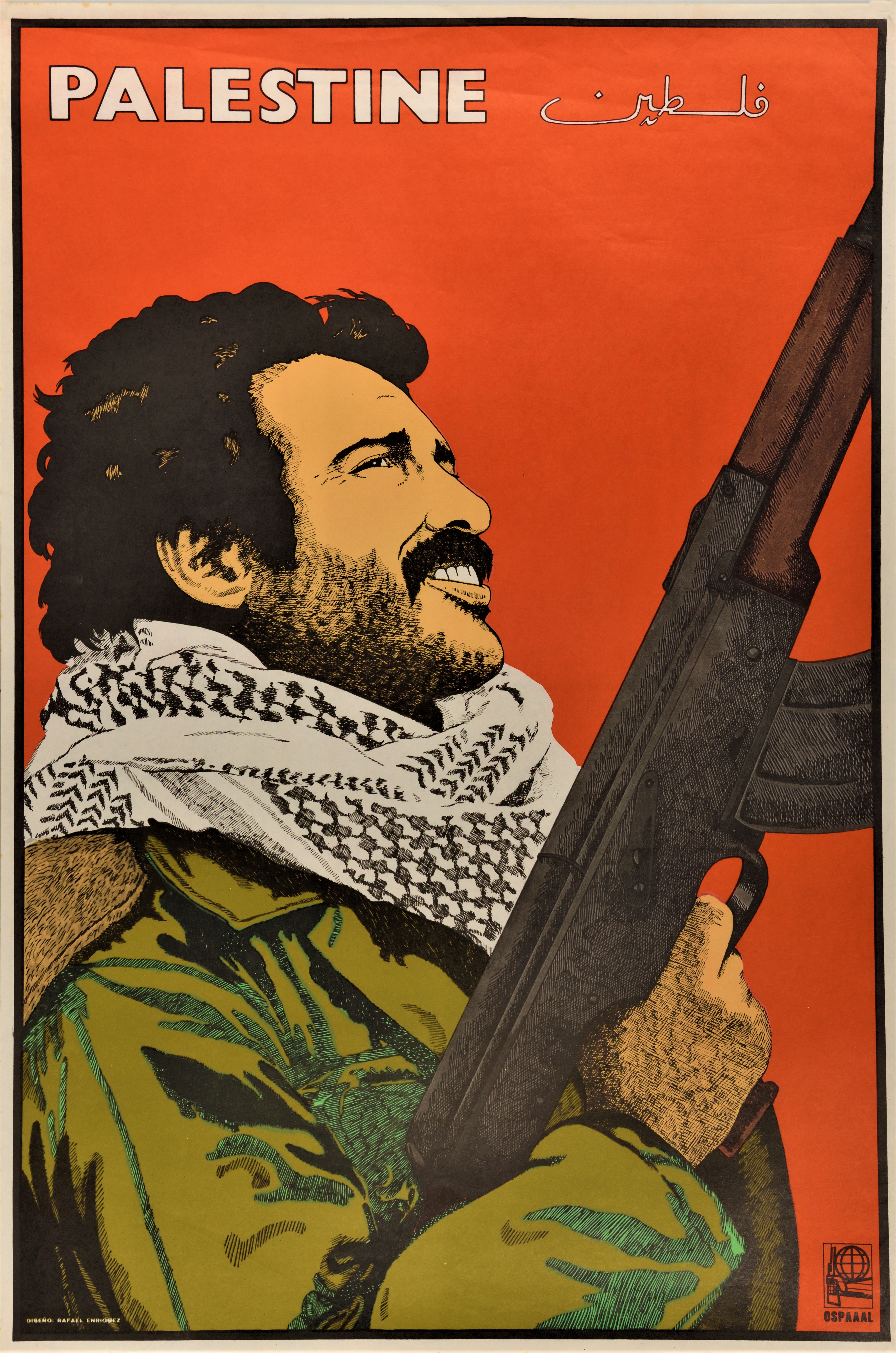 This poster titled "Palestine" was issued by the Organization of Solidarity with the People of Asia, Africa and Latin America (OSPAAAL),designed by Rafael Enriquez.