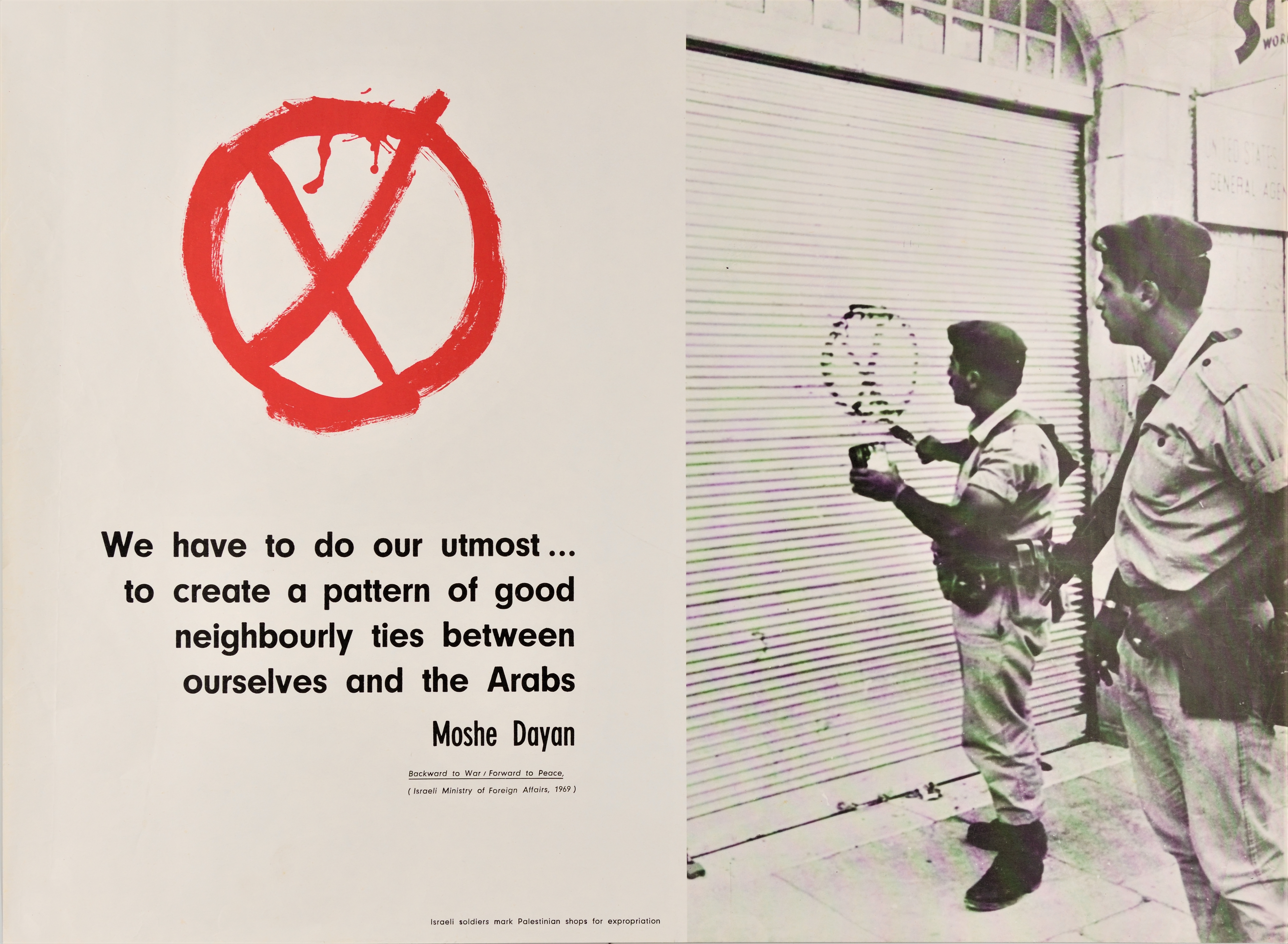 ملصق صادر عن منظمة التحرير الفلسطينية يوثق مصادرة جنود الاحتلال الإسرائيلي للمحلات الفلسطينية عام 1969.