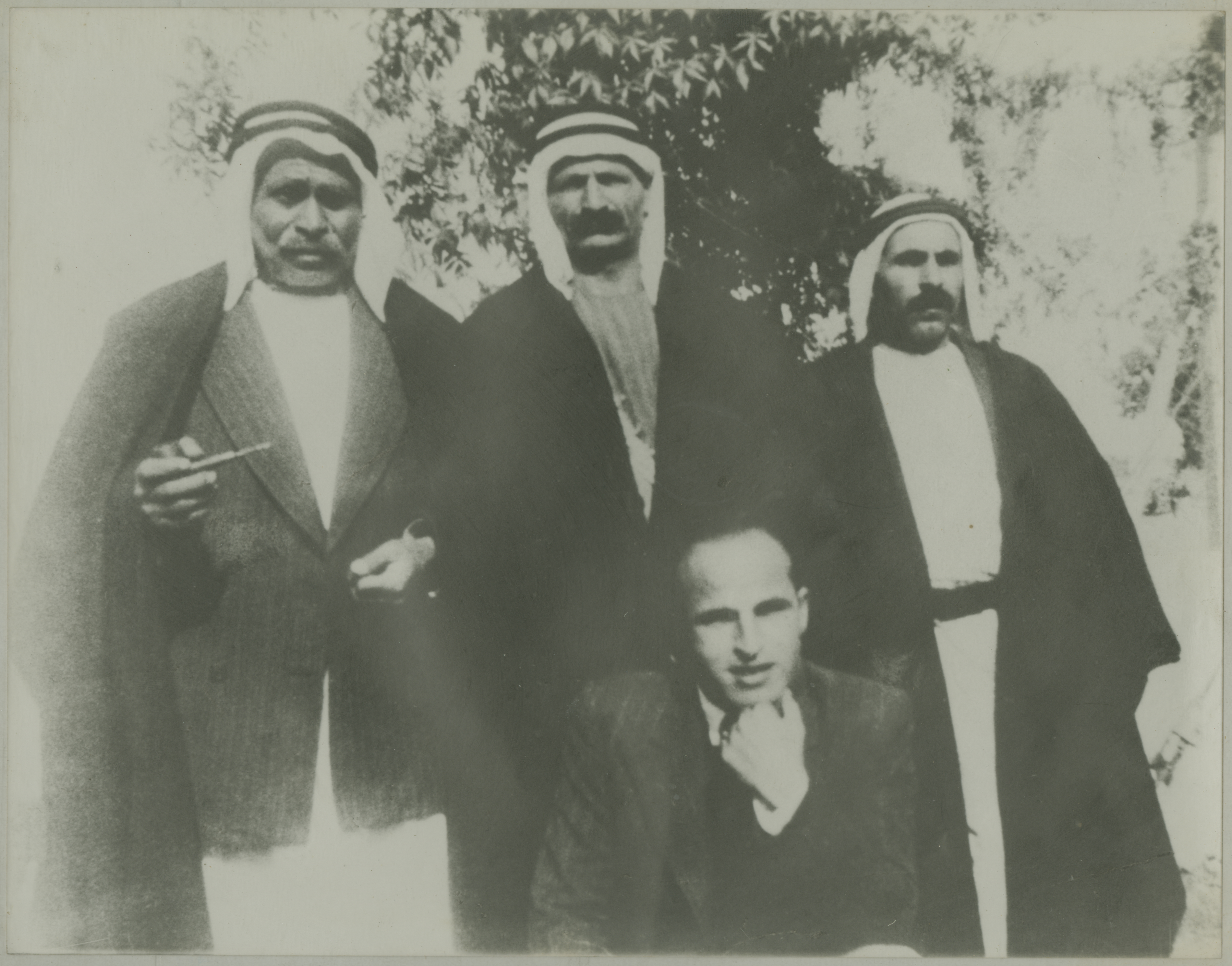 Msallam's family from Birzeit on a visit to their cousin in al-Ramleh. Shown in the photo; right to left, Musa Msallam, Soliman Msallam, Juries Msallam (seated), and Anton Msallam