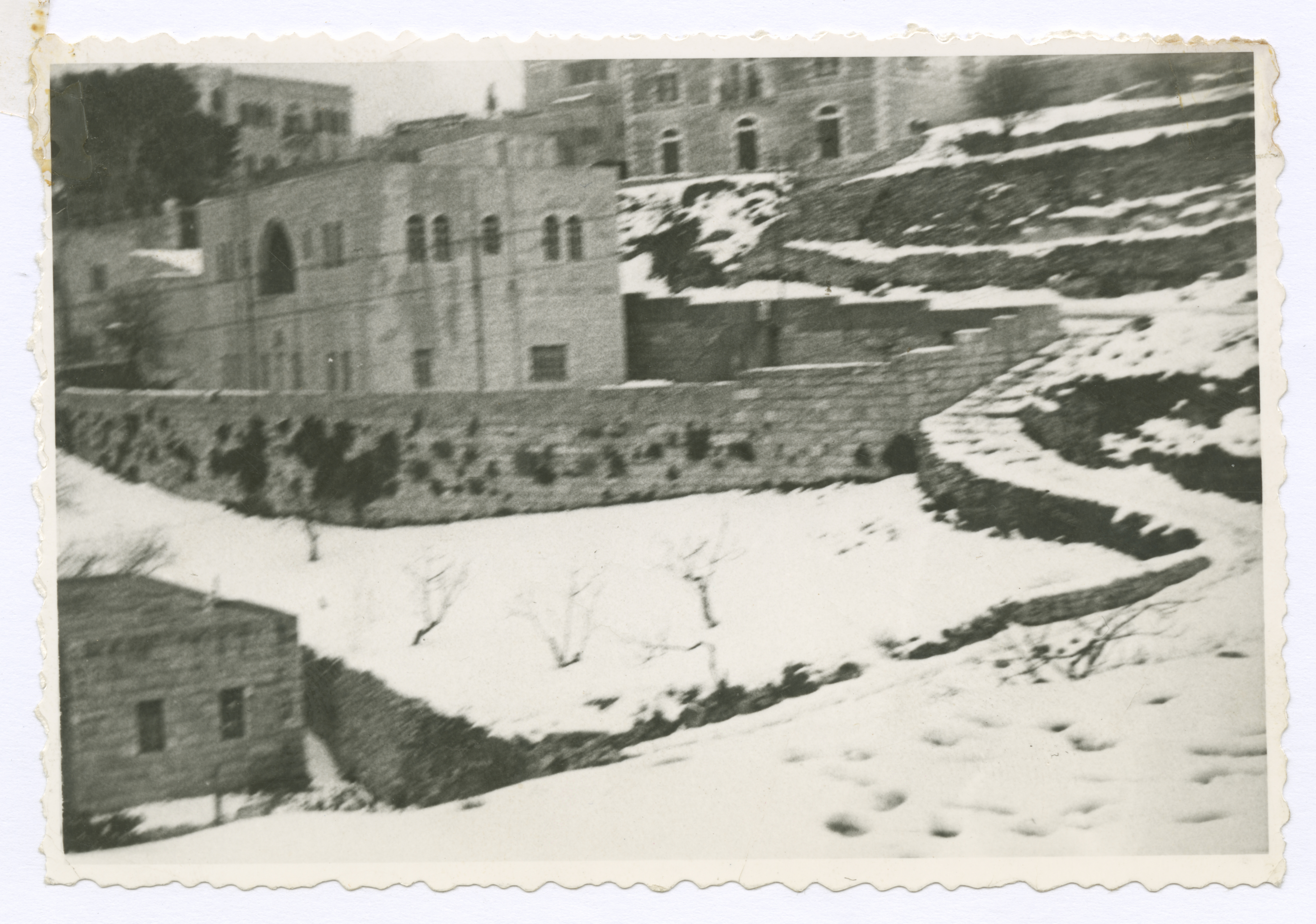صورة غير ملونة تظهر مجدموعة من أبينة مدينة بيت لحم وهي مغطاة بالثلج خلال موسم الشتاء عام 1957. وجدت الصورة في أرشيف محمد سالم ذزيب.