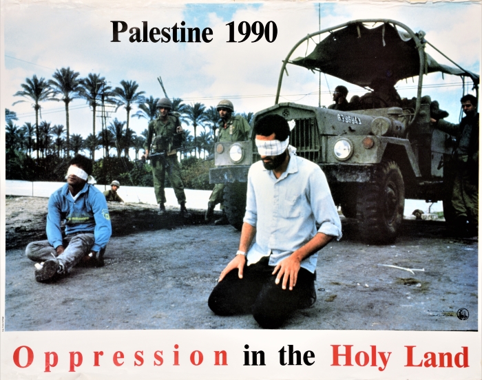 ملصق بعنوان "الاضطهاد في الأرض المقدسة" صادر عن الإعلام الموحد لمنظمة التحرير الفلسطينية عام 1990، ويتضمن صورة توثق اعتقال واضطهاد فلسطينيين من قبل قوات الاحتلال الإسرائيلي.