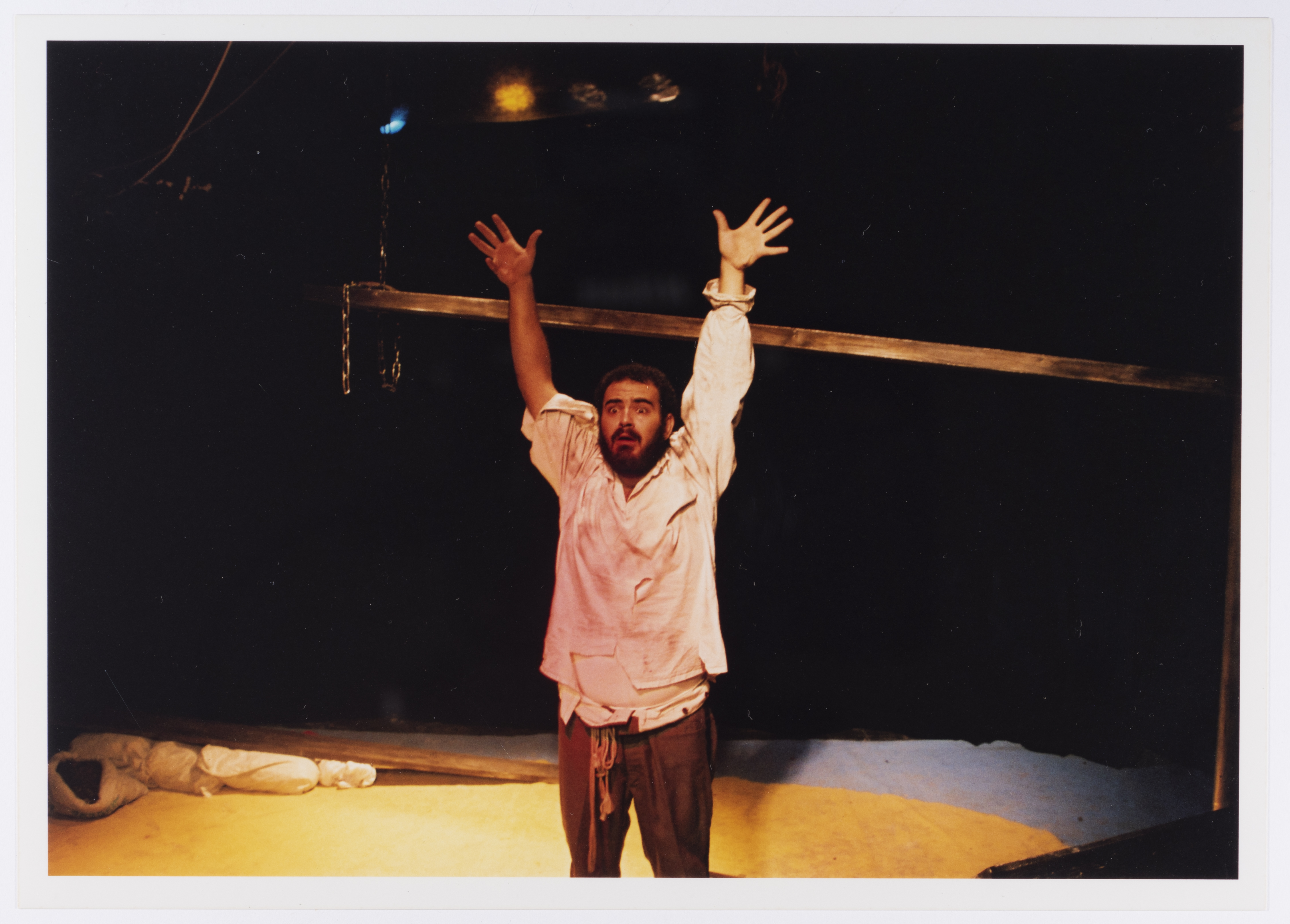 A photograph of Palestinian playwright, actor, and director Amer Hlehel on stage during the theatrical performance of one of his own plays titled "Diab".