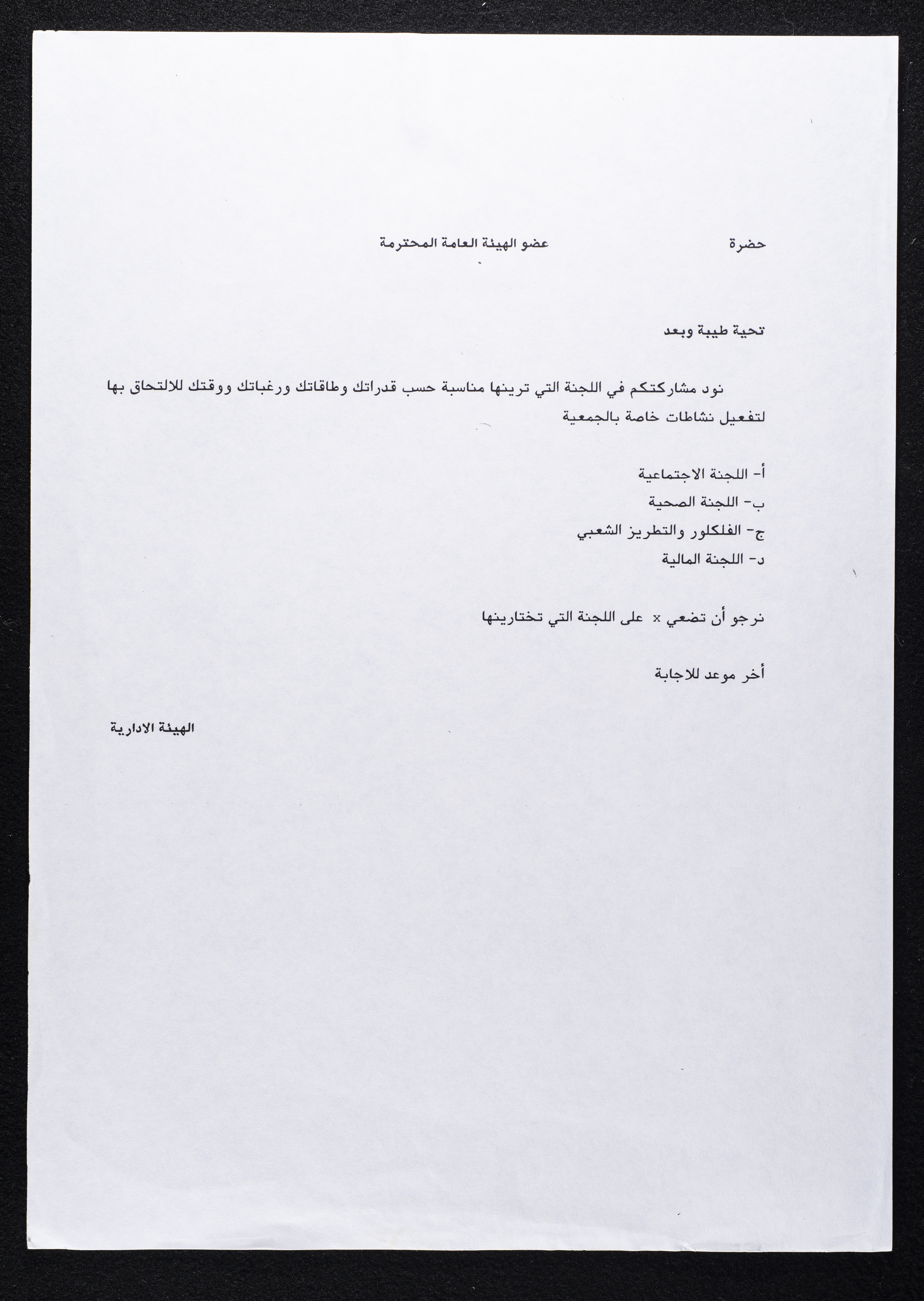 Found in the Birzeit Women's Charitable Society Collection, this printed letter in Arabic was sent from the Administrative Board of Birzeit Women's Charitable Society to the General Body of the Society requesting that they enrol in one of the following, the social committee, the health committee, the folklore and Palestinian embroidery committee, or the financial committee.