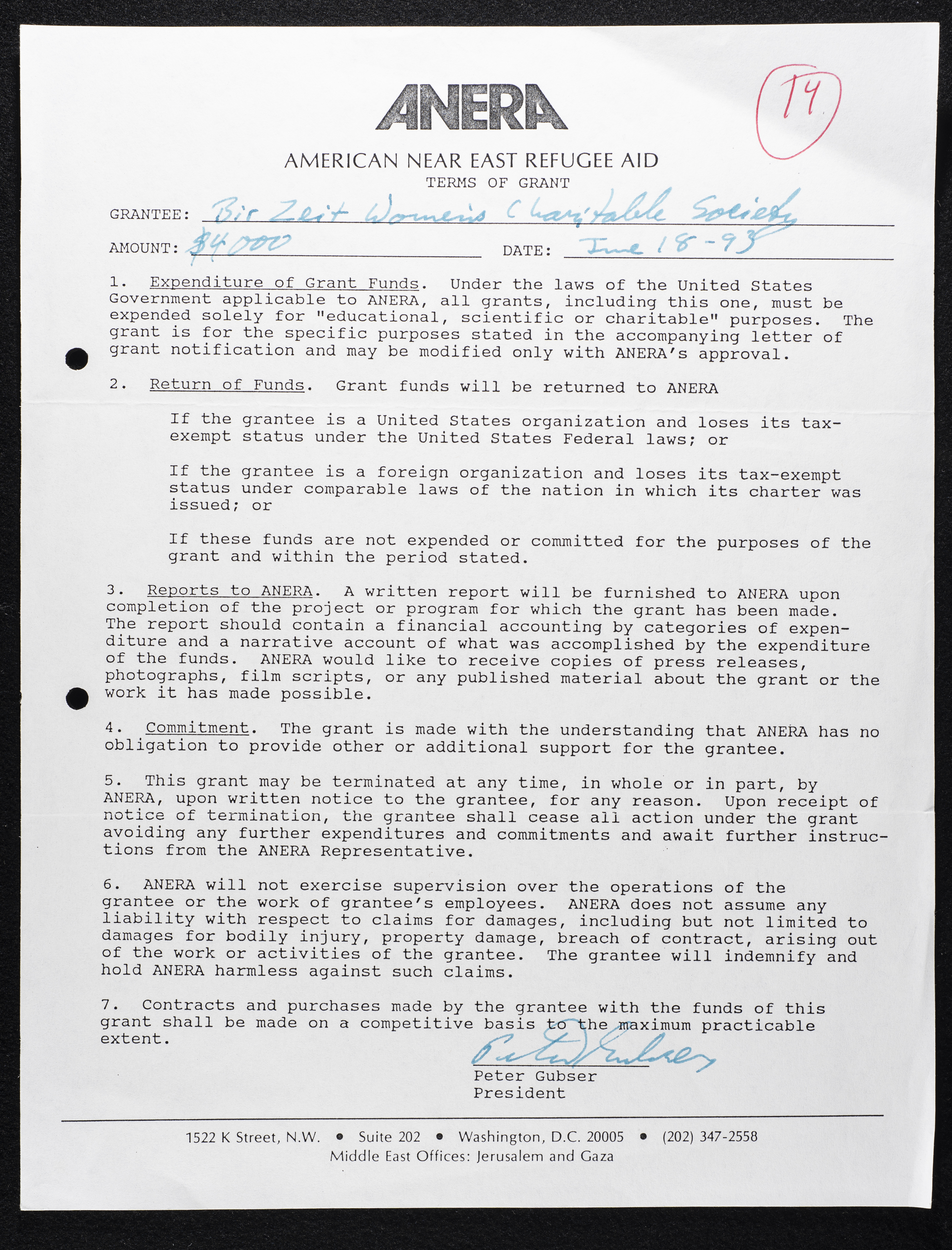 Found in the Birzeit Women's Charitable Society Collection, this printed document in English includes the terms of a grant received by Birzeit Women's Charitable Society from the American Near East Refugee Aid (ANERA) in 1993.