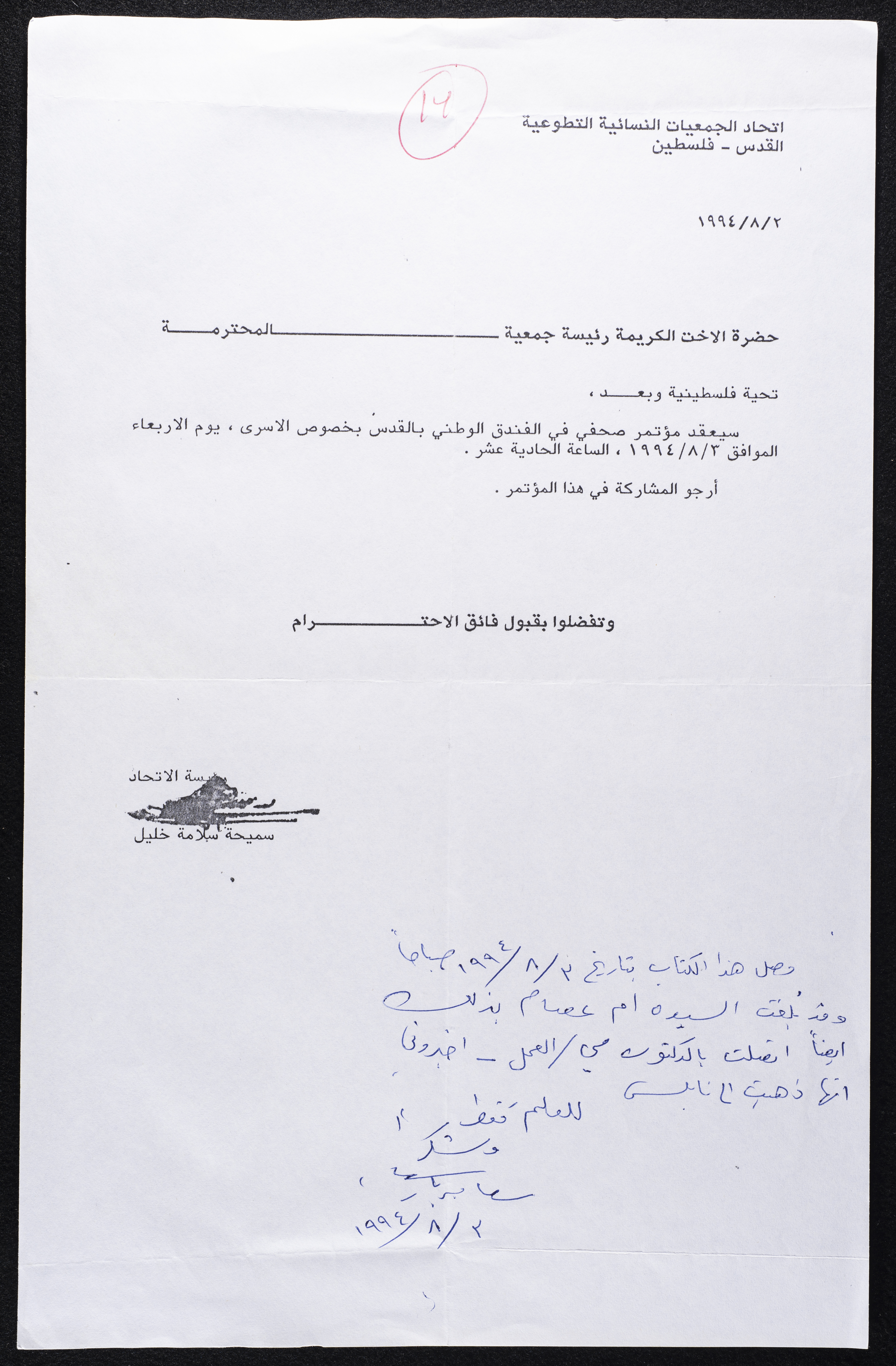 Found in the Birzeit Women's Charitable Society Collection, this letter was sent from Samiha Khalil, President of the Union Of Women Voluntary Societies, to the President of Birzeit Women's Charitable Society inviting her to a press conference on Palestinian prisoners on August 3, 1994. A handwritten note at the bottom by Suʿad Barbar indicates that May Kaila, the President of the Society, could not attend the press conference since she was on a visit to Nablus.