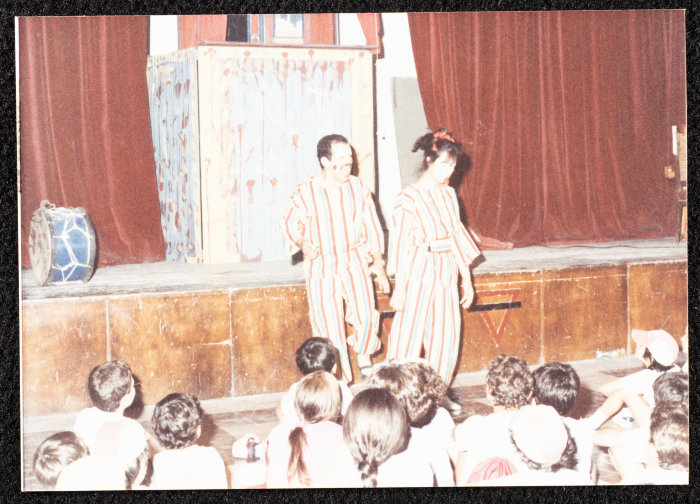 Taken in 2002, this colour photograph captures a freeze of George Ibrahim's children's play, "The Shoemaker and the Sultan". This children theatre show was produced by al-Kasaba Theatre and Cinematheque.